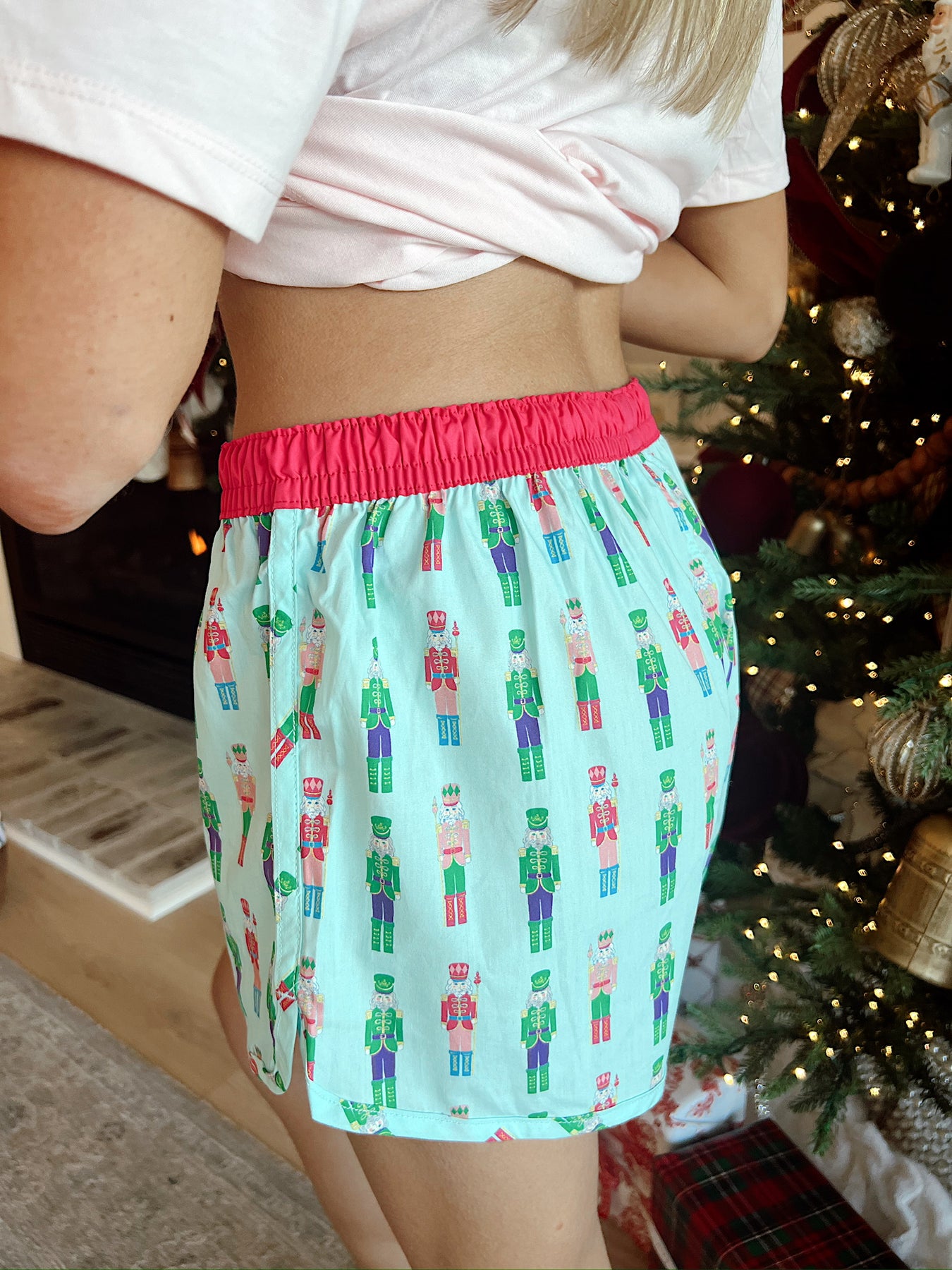 These shorts feature pink contrast elasticized waistband with adjustable drawstrings, minor side slits, and nutcracker prints throughout.