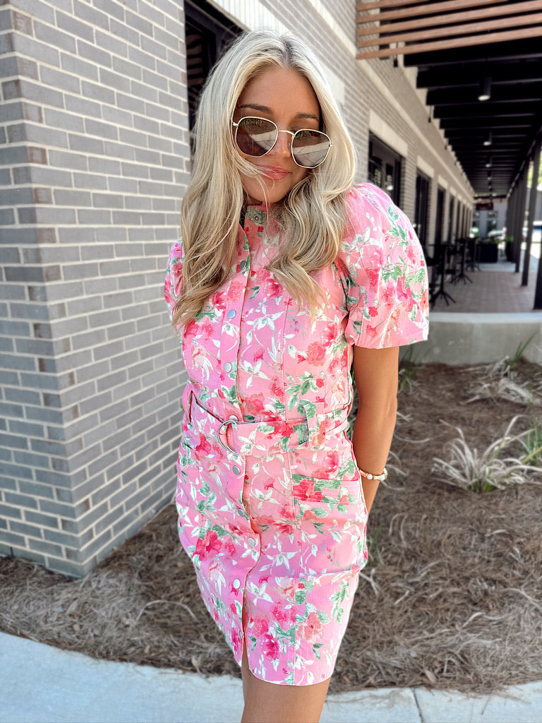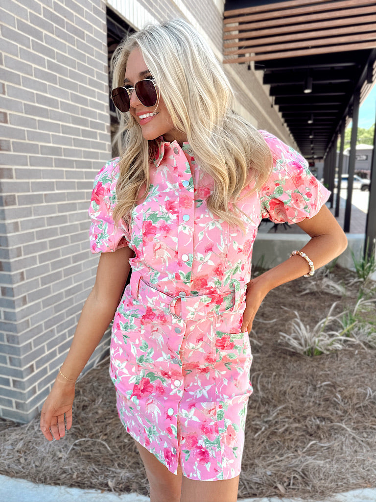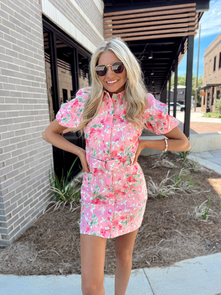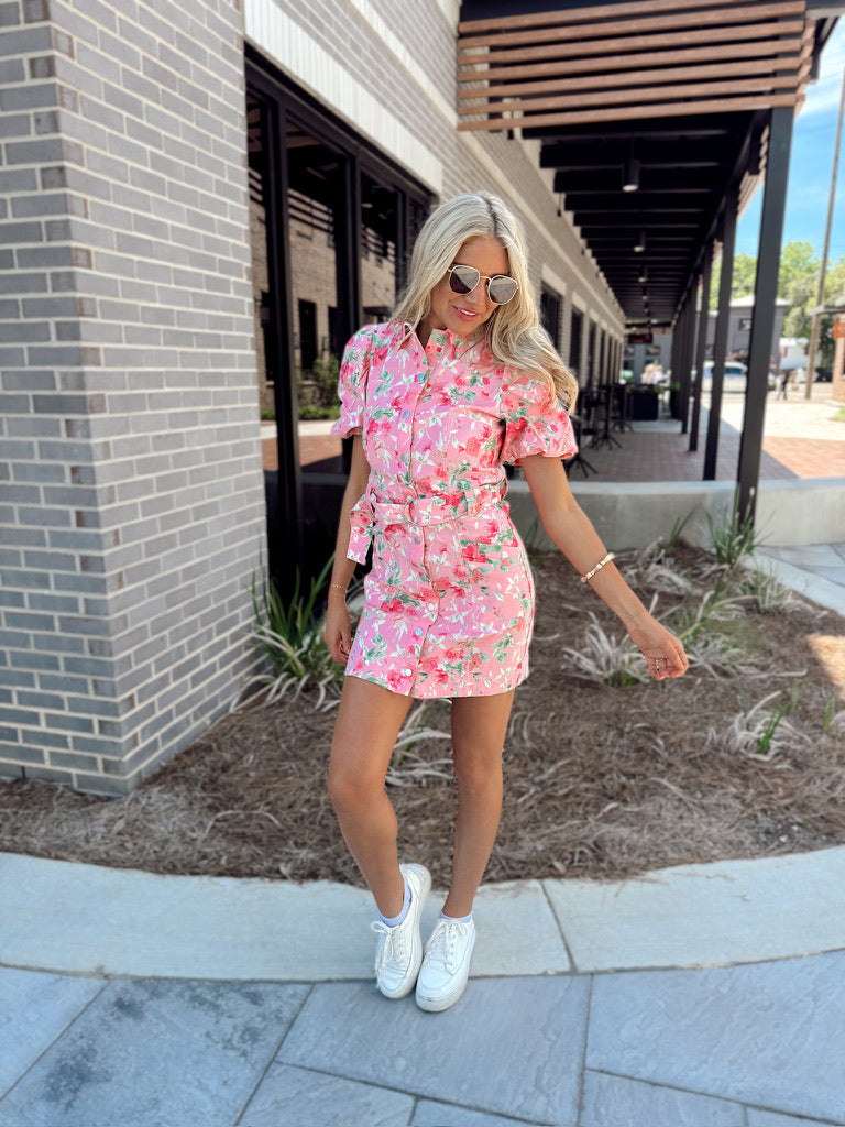 This mini dress features collared neckline, front button closures, puffy shorts sleeves, belt loop with adjustable belt, two front square pockets, and floral prints all throughout.