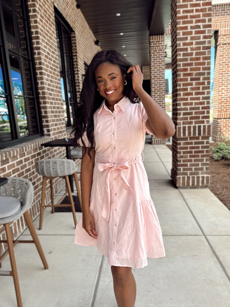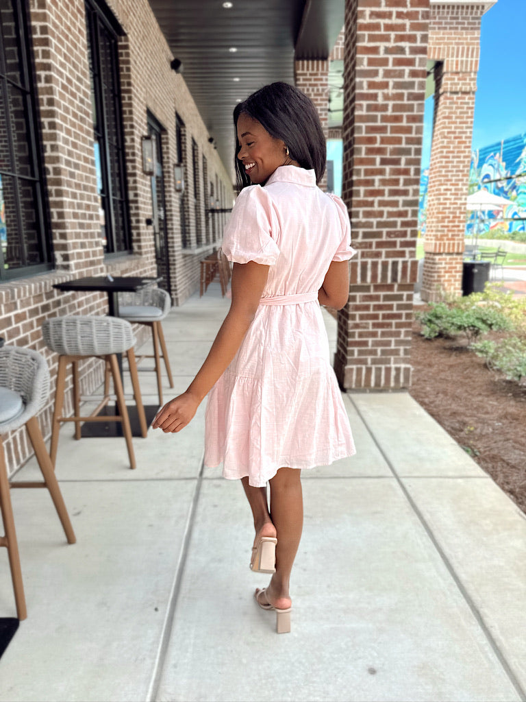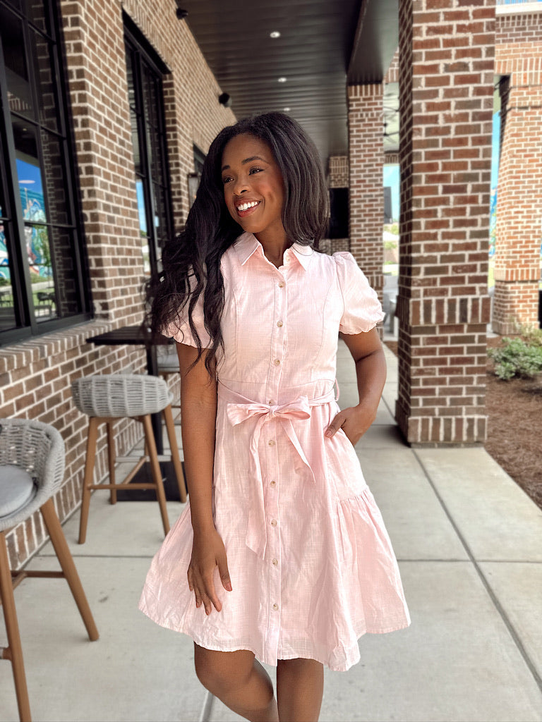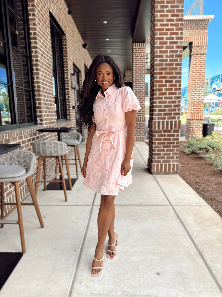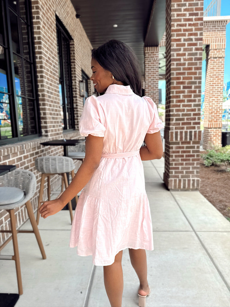 This dress features collared neckline, mini length, full front button closures, short puffy sleeves, belt loop with self-tie strap, side pockets, lined, and pleated details on the side of skirt.