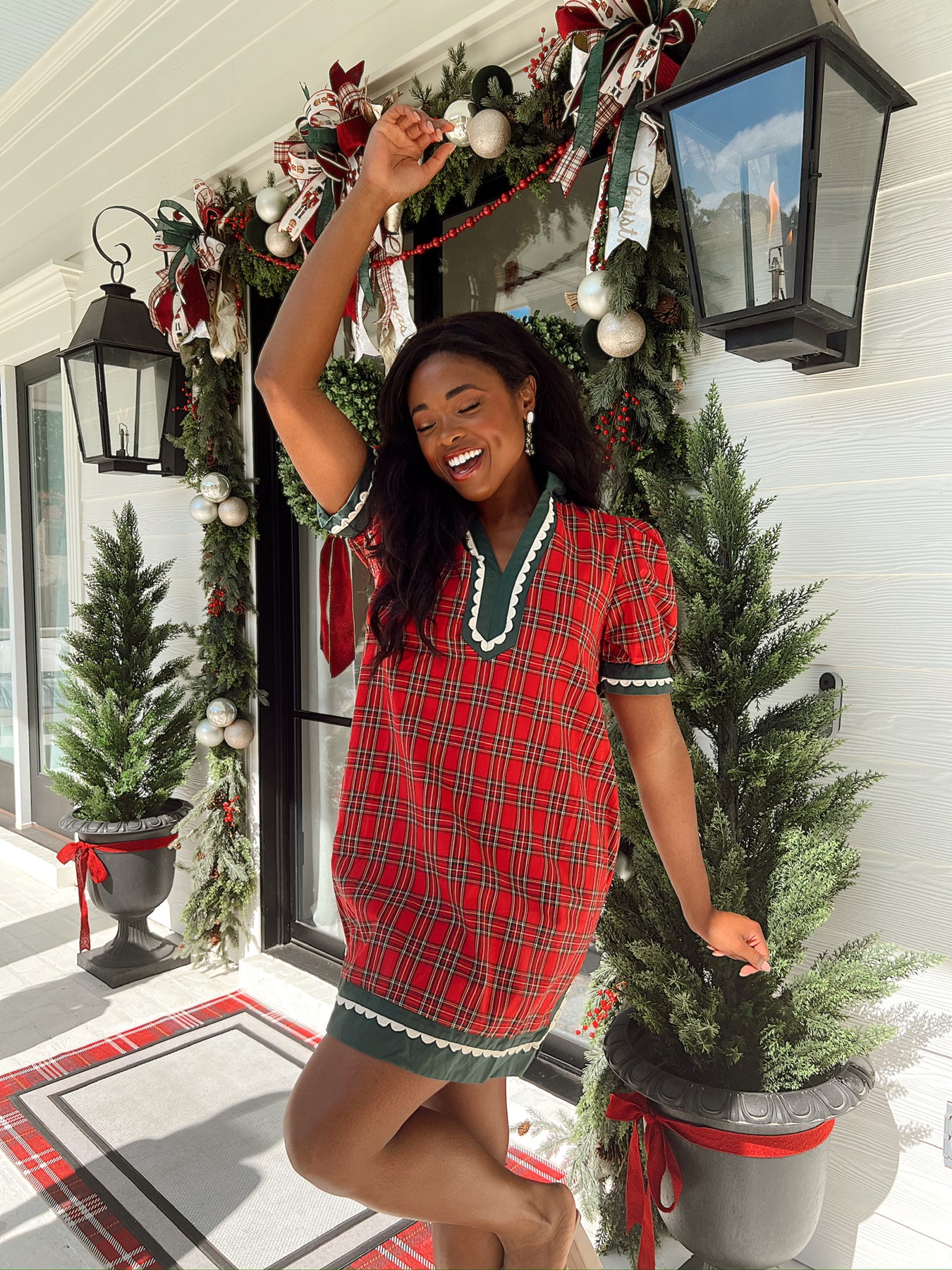 This dress features plaid pattern, short lantern sleeves, mini length, hidden side pockets, slit hem featuring contrast accent caftan-inspired split collar band and hem, and lined.