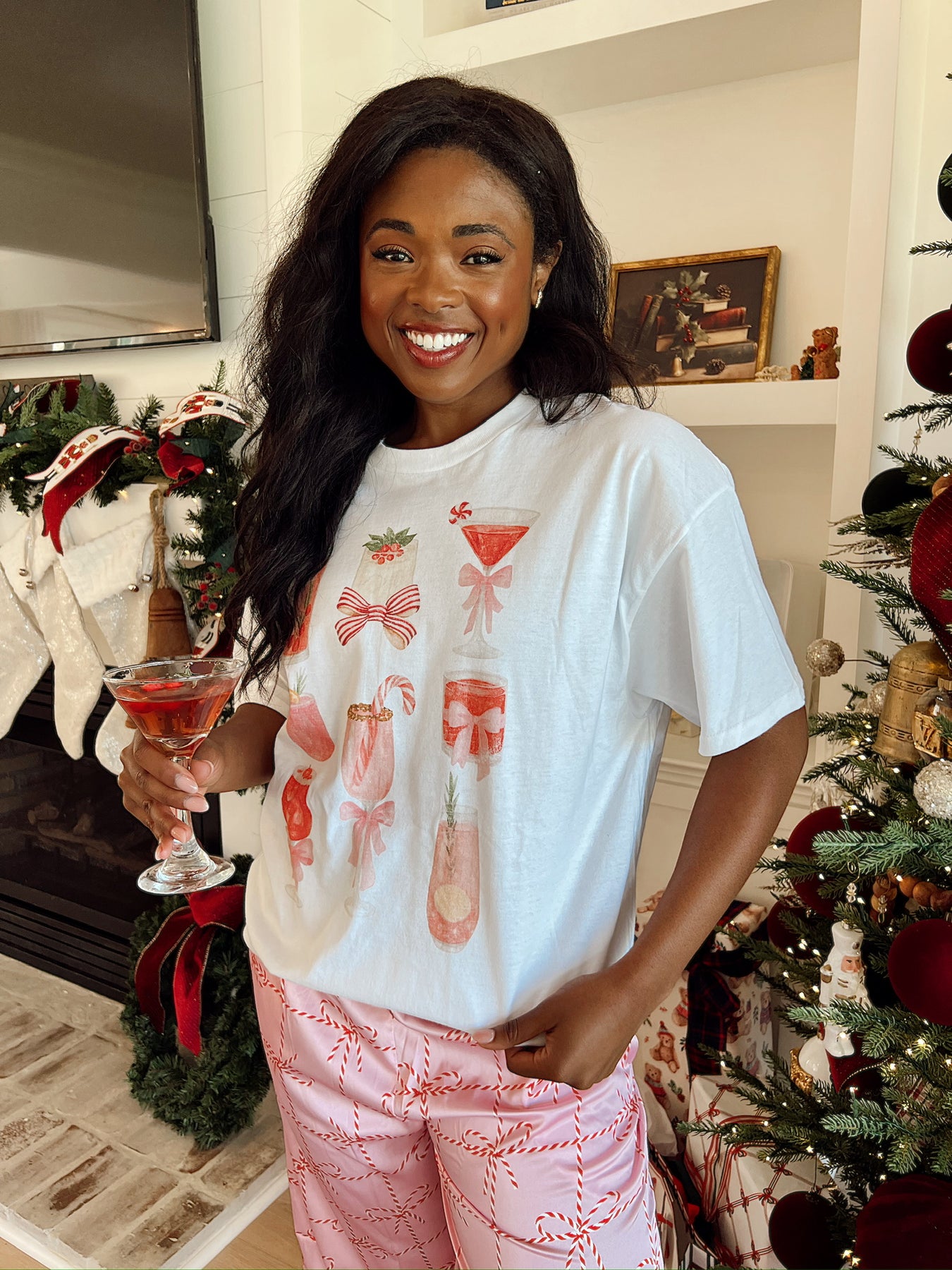 This graphic top feature crew neckline, short sleeves, and Christmas theme drinks.