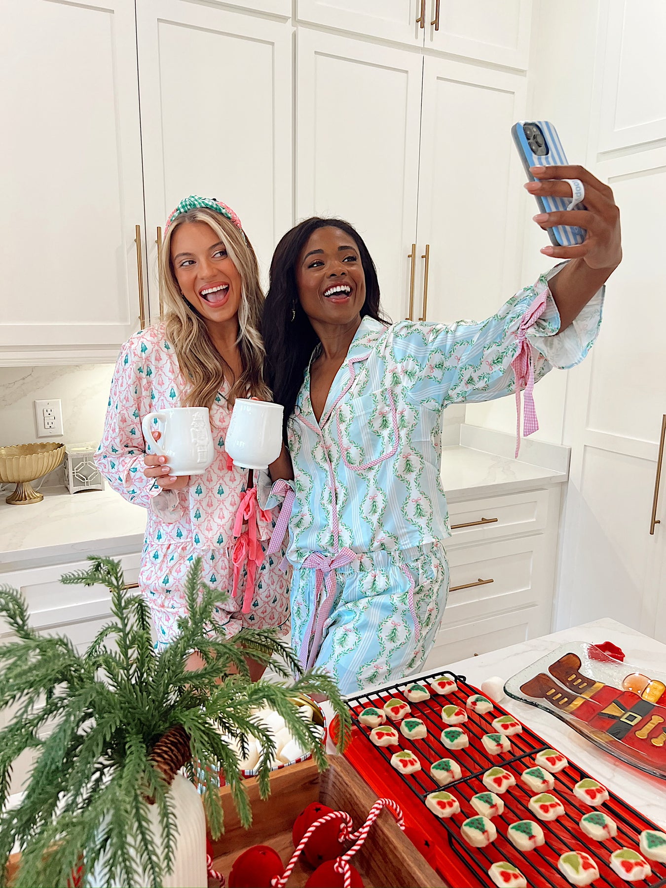 The matching bottom features short length, elasticized waistband with adjustable gingham drawstring, hidden side pockets, graphic print of Christmas tree and stripes all over, and pink gingham contrast trim.