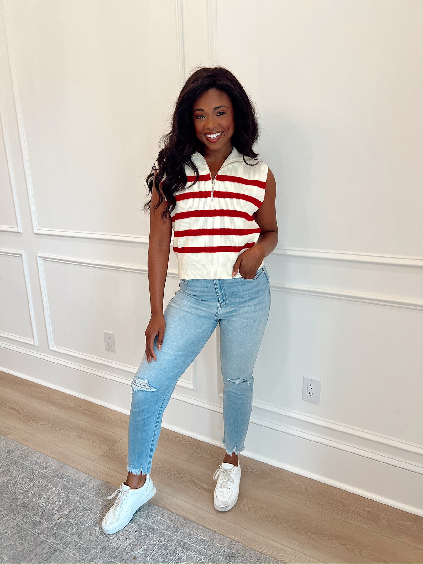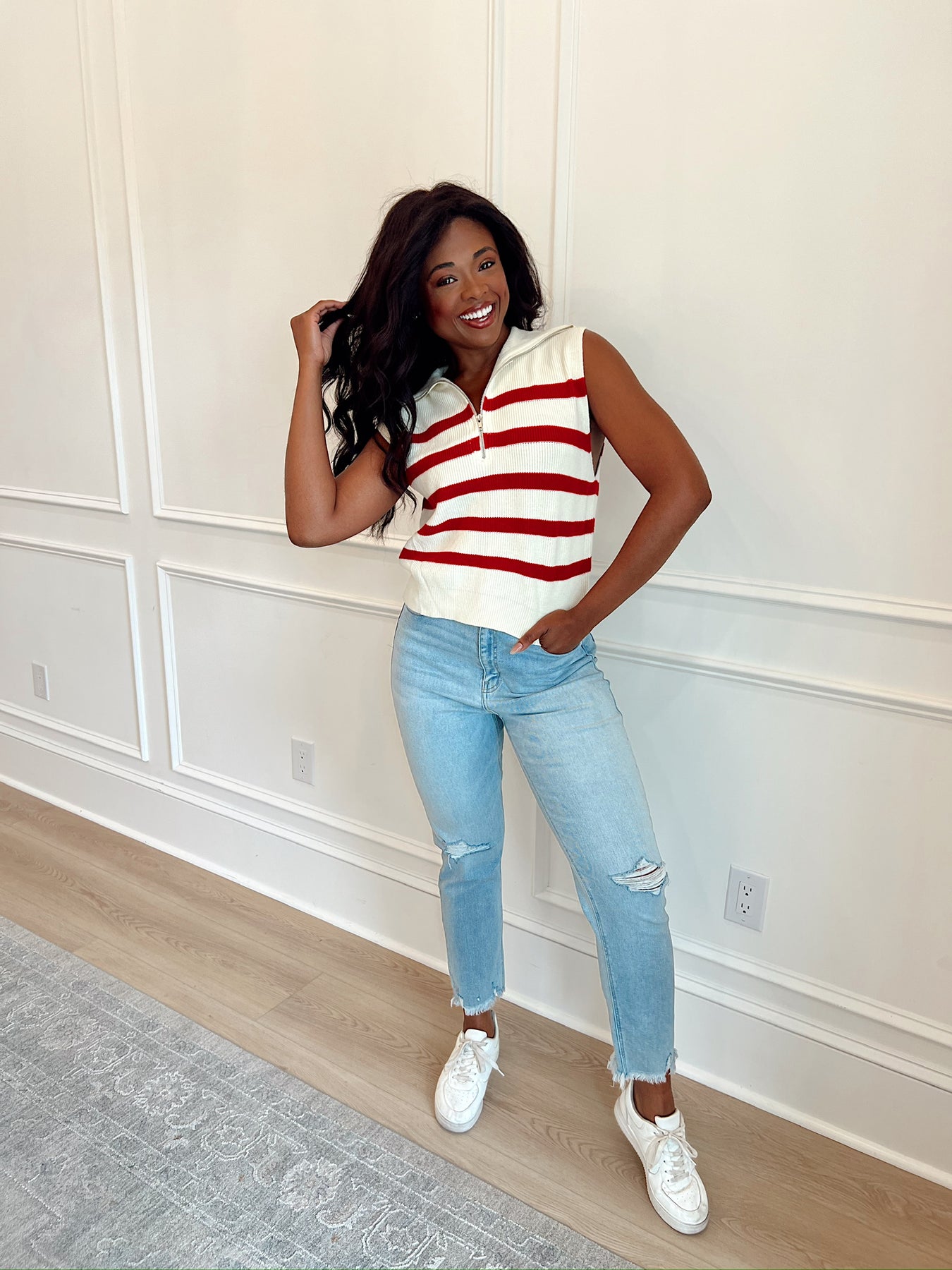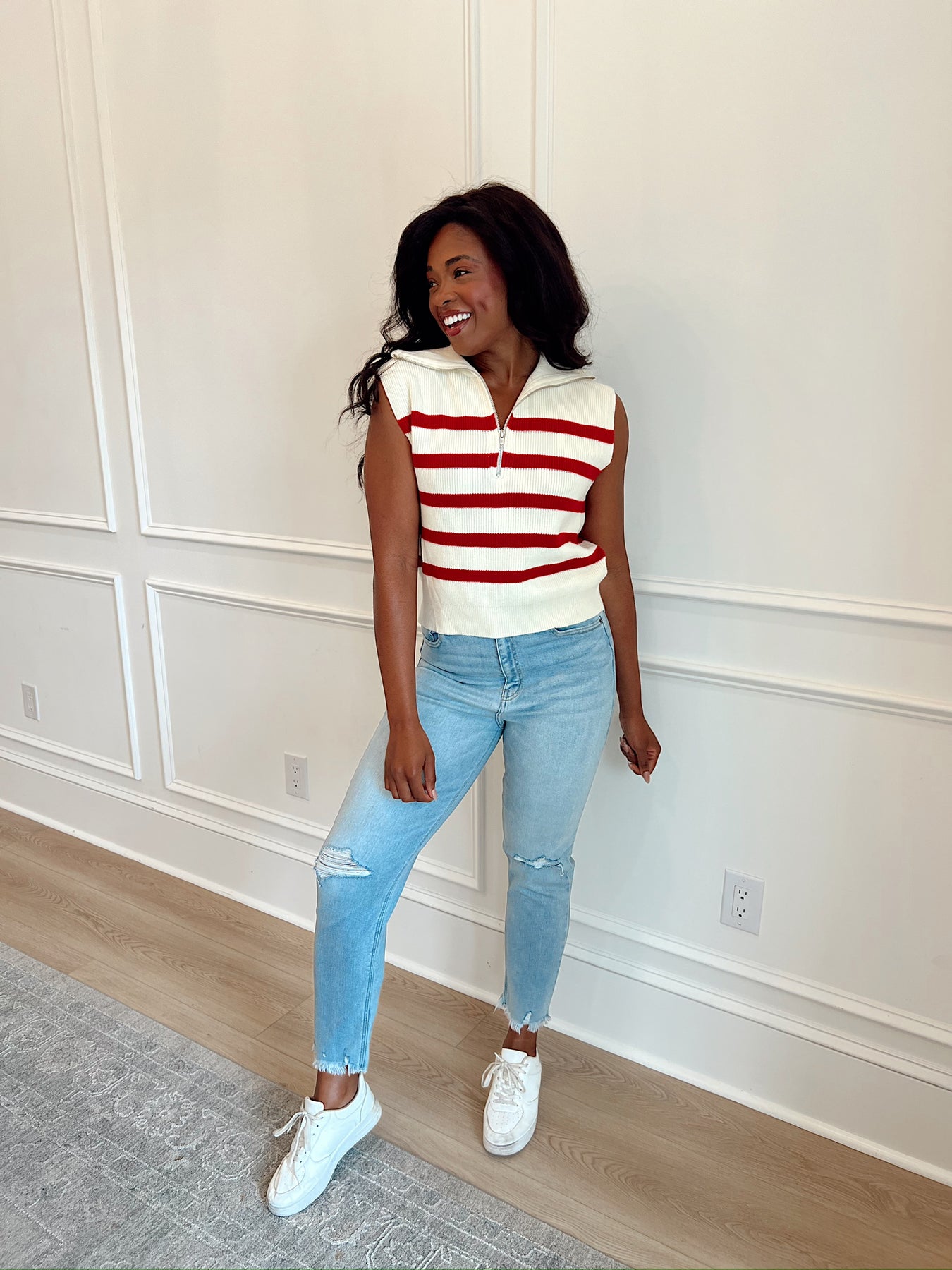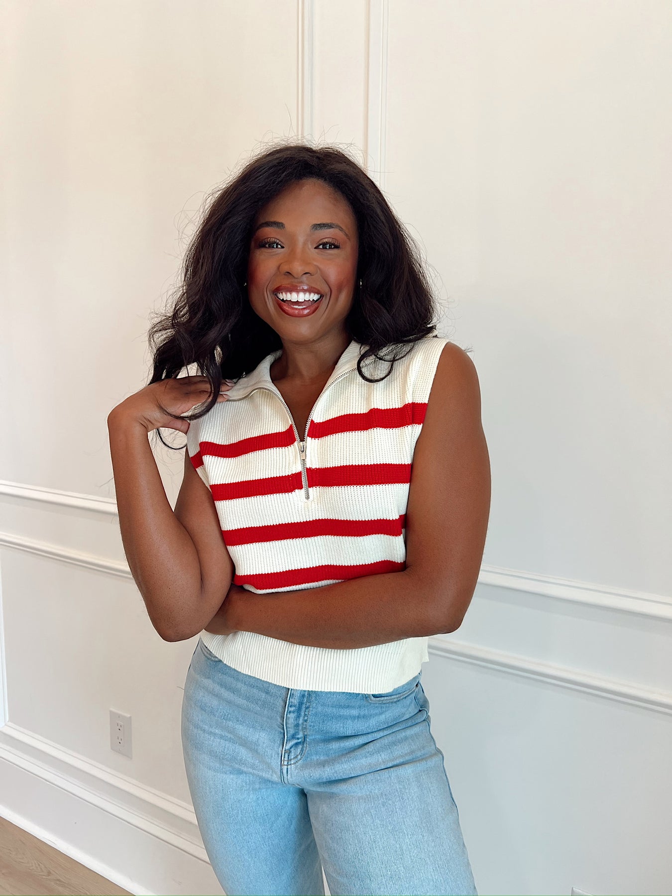 This sweater vest features quarter zip closure, collared neckline, striped pattern, wide sleeveless cut, and semi-relaxed fit.