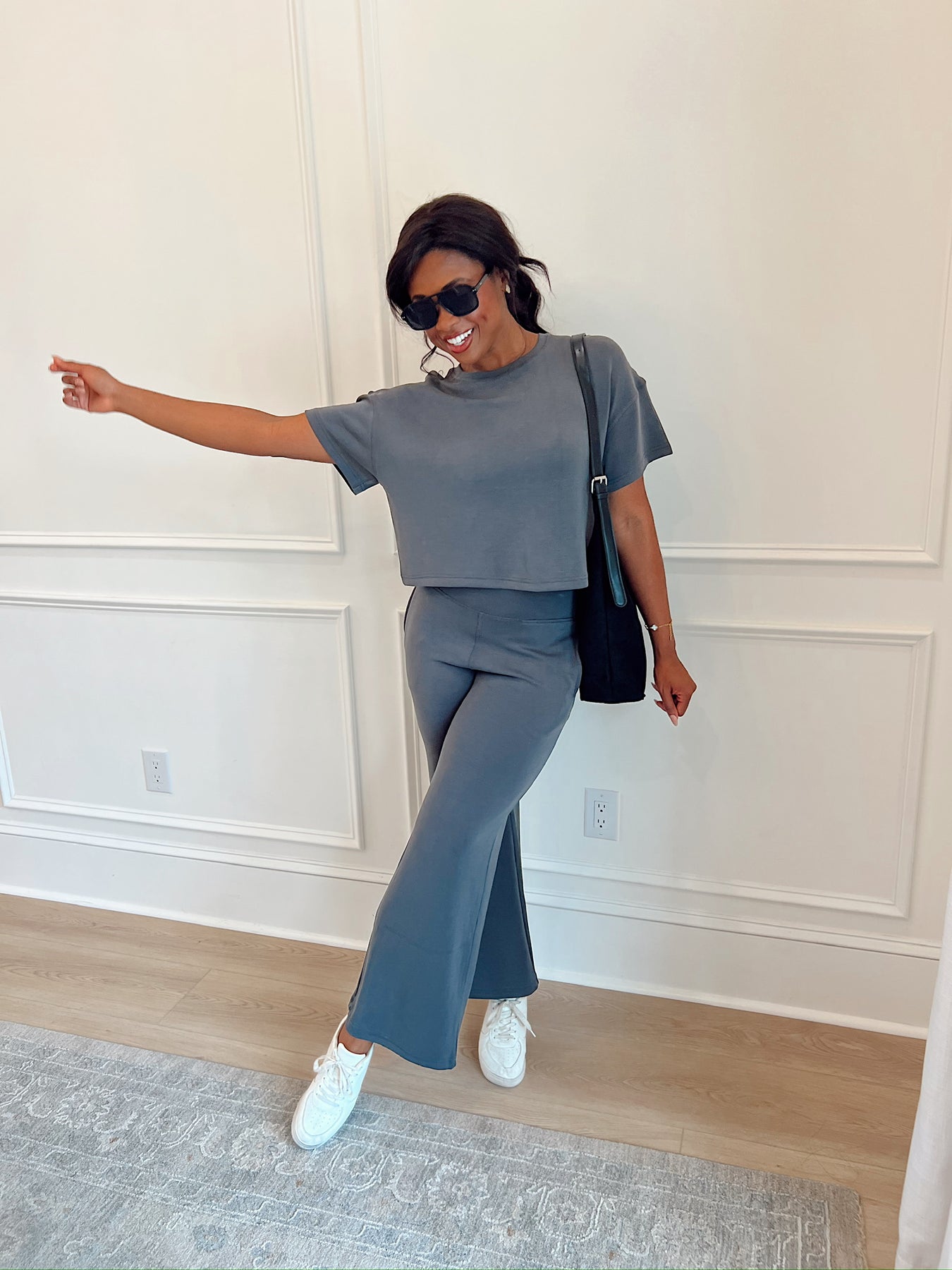 The matching bottoms features two hidden side pockets, wide pant fit, and cinch high waistband.