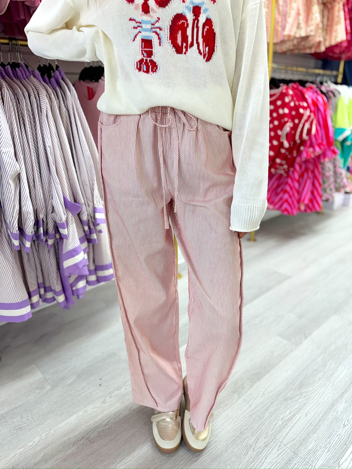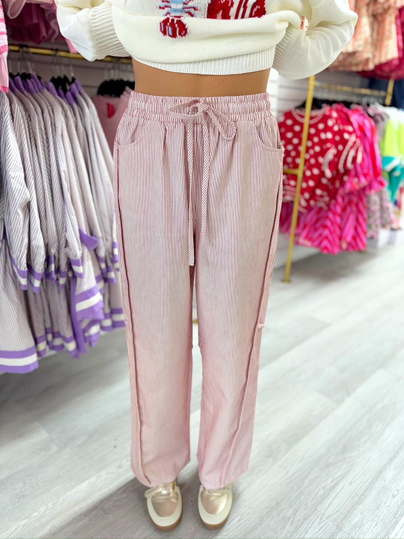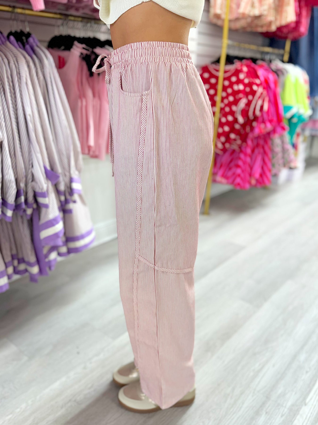 These pants features elasticized waistbands with adjustable drawstrings, trim stitching details, stripe pattern, side pockets, and wide leg fit.