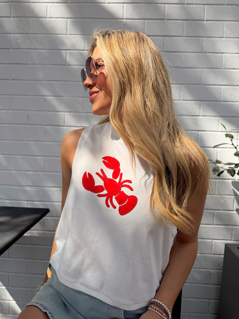 This top features crew neckline, wide sleeveless cut, wide armholes, and embroidered crawfish on the front.