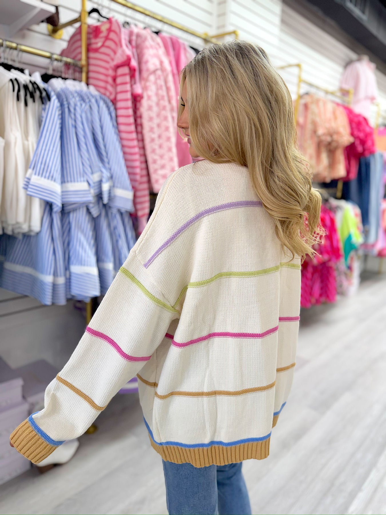 This cardigan features open front design, long sleeves, two pockets, knit material, and contrast stripe details.