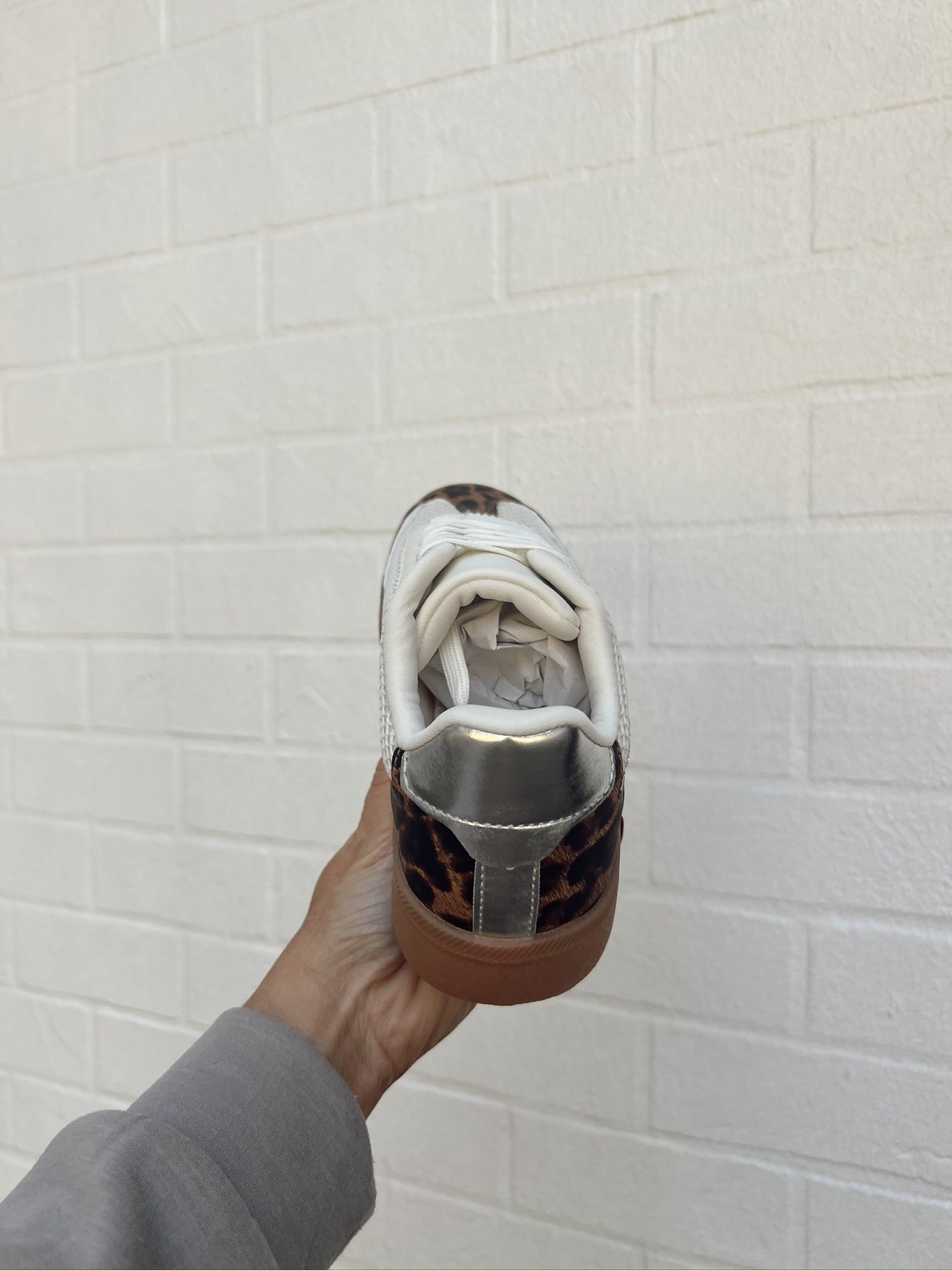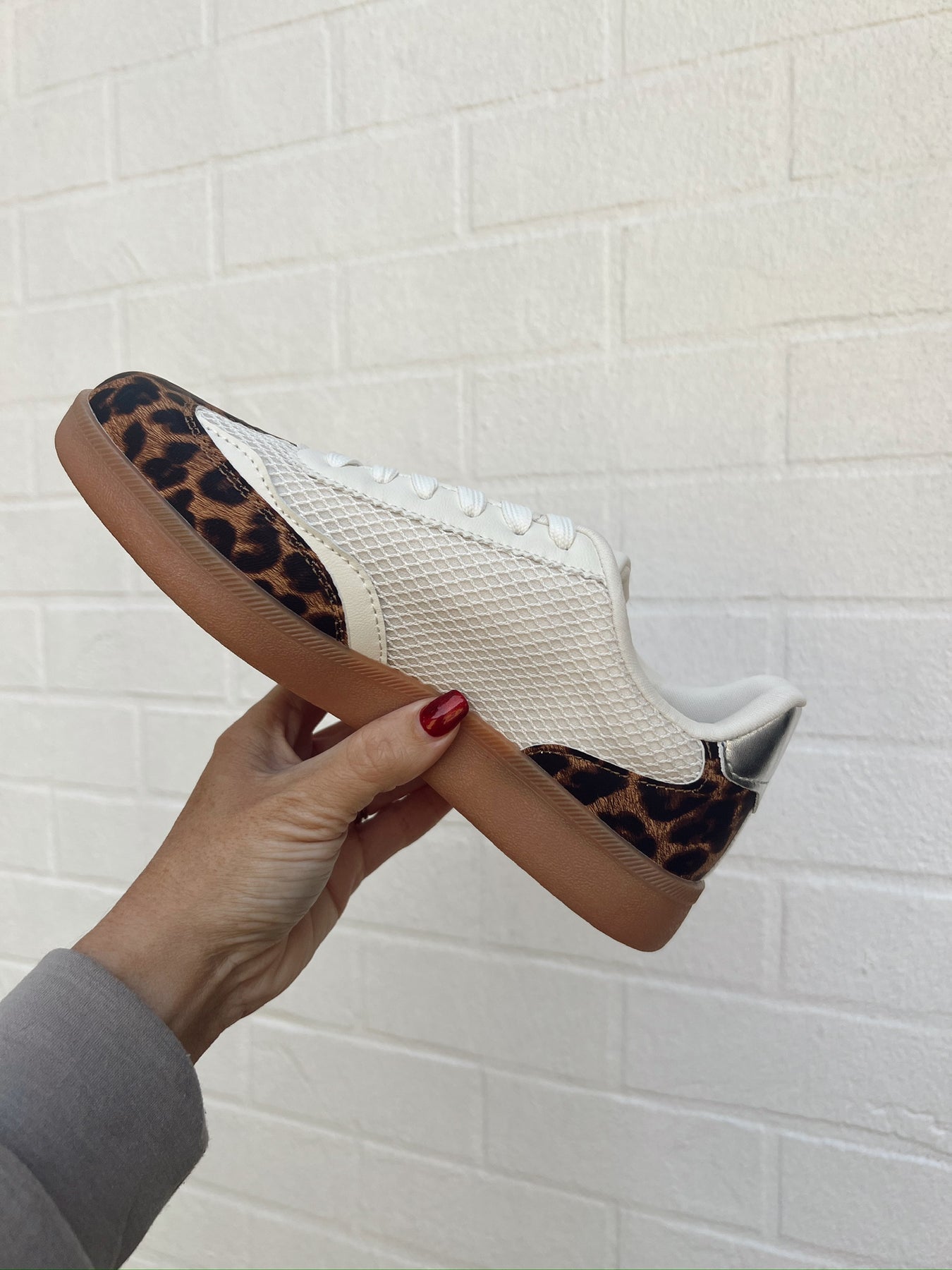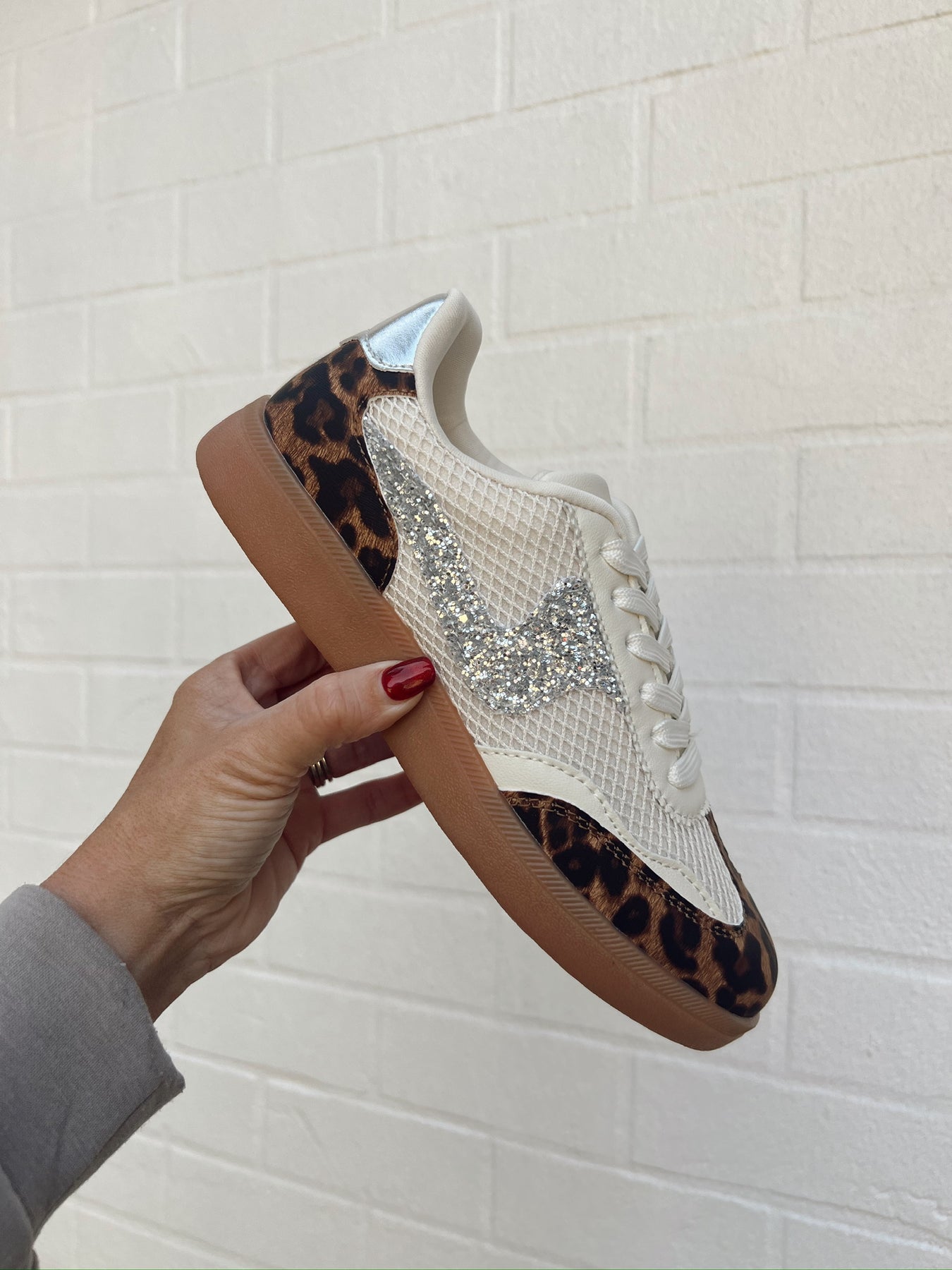 Those sneakers features braided mesh material, faux leather leopard prints, sequin stripe detail on one side, and gummy outer sole.