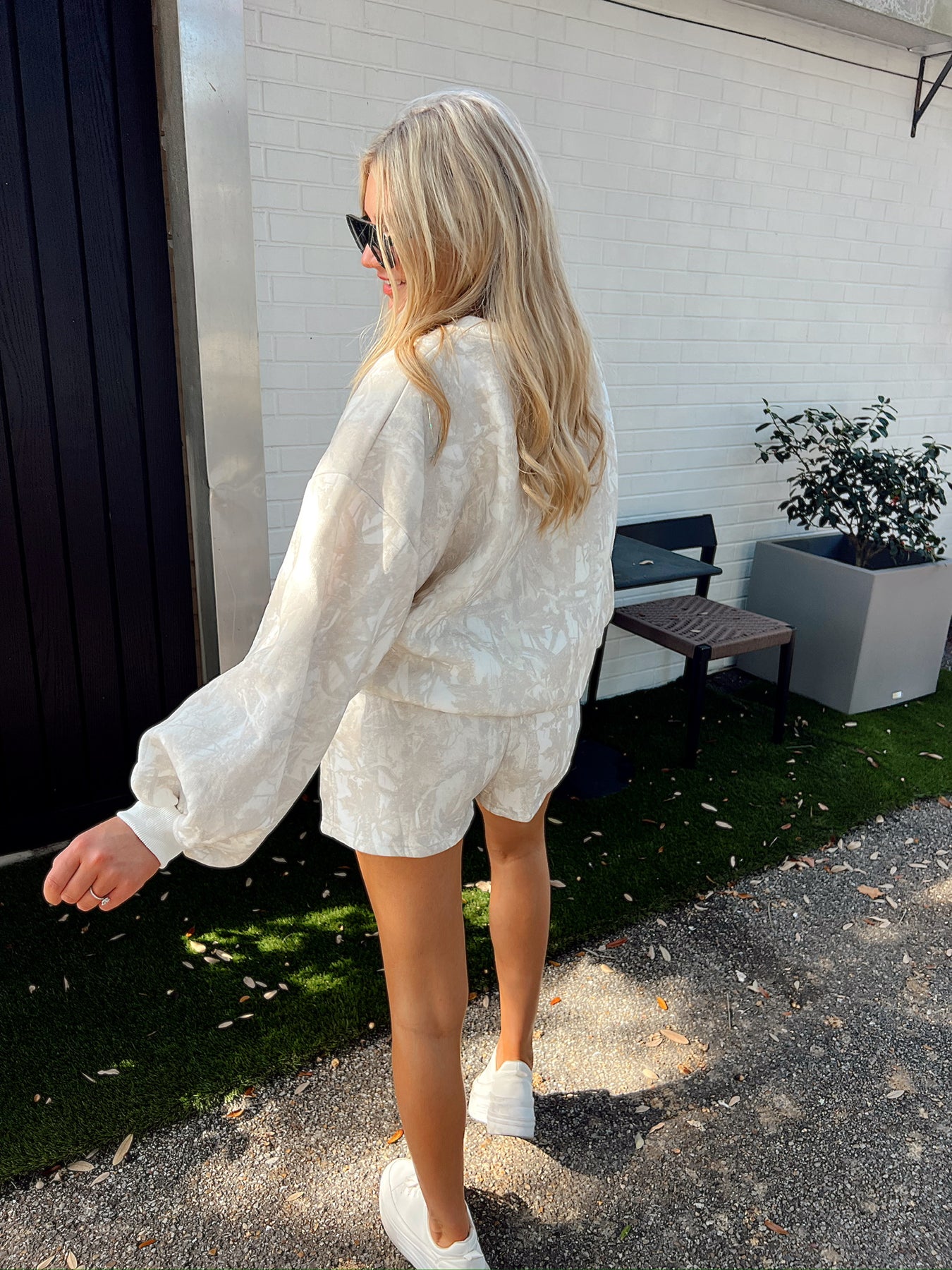The matching shorts features wide elasticized waistband with adjustable drawstrings, two side pockets, and woodland camouflage prints all over.