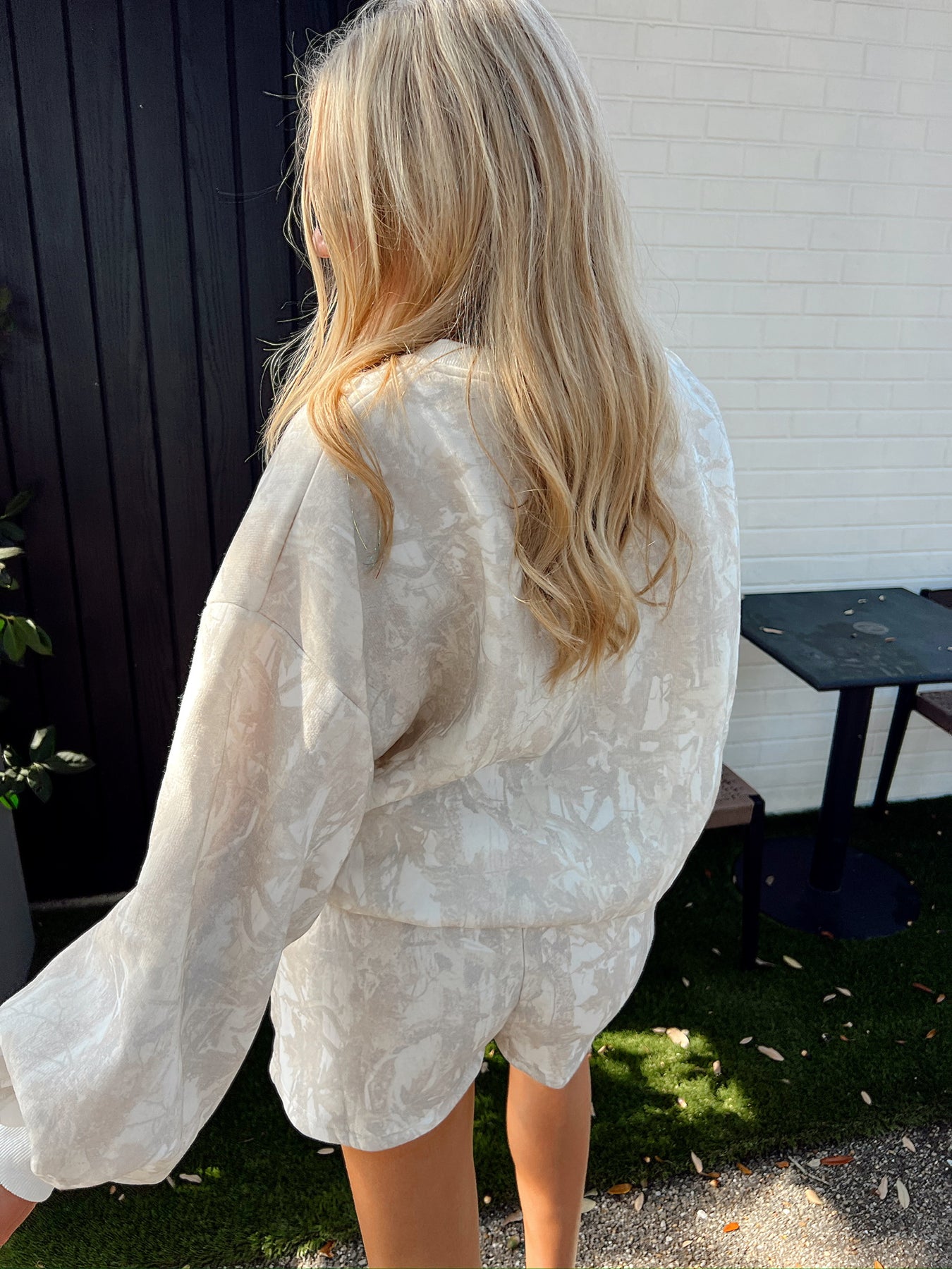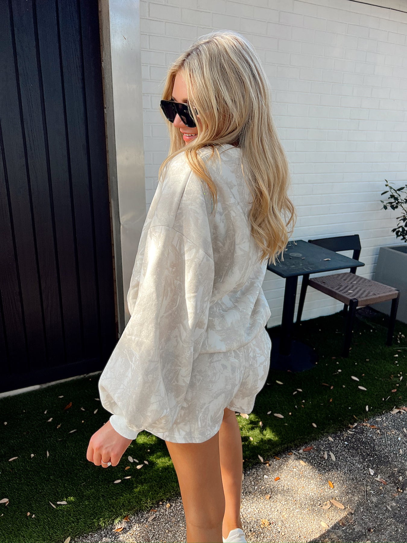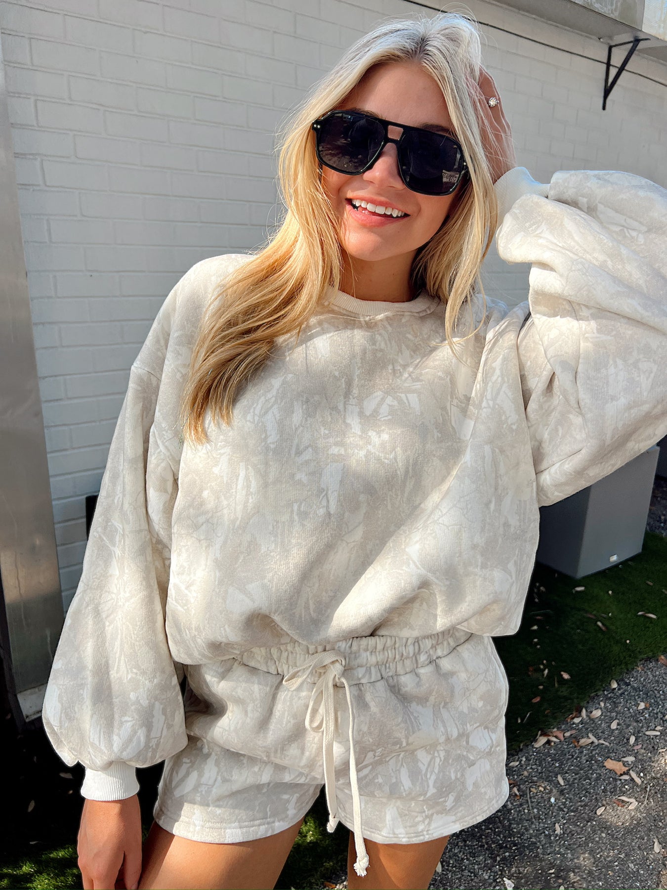 This sweatshirt features crew neckline, long sleeves with white contrast cuffs, light woodland camouflage prints all over, and relaxed fit.