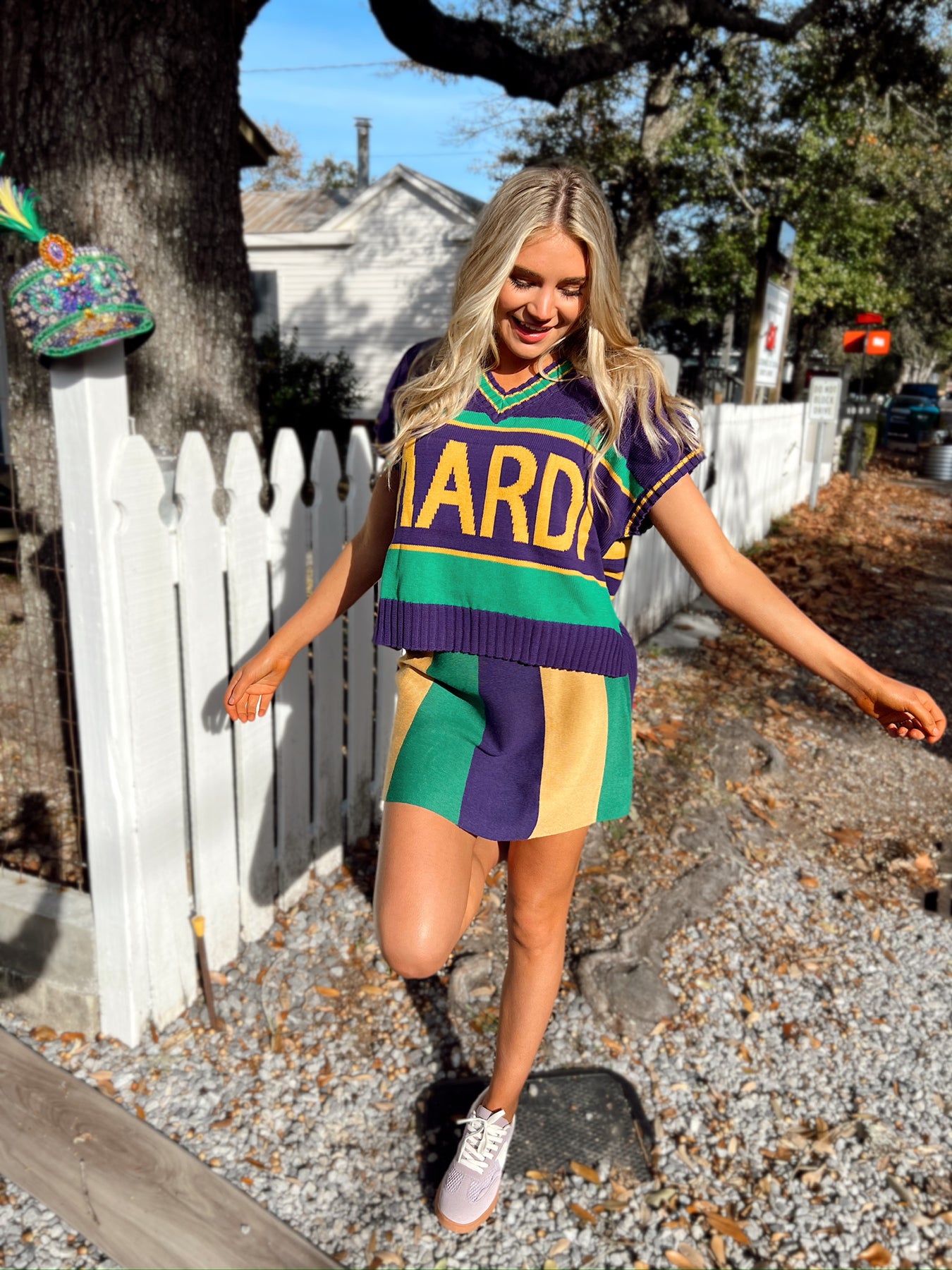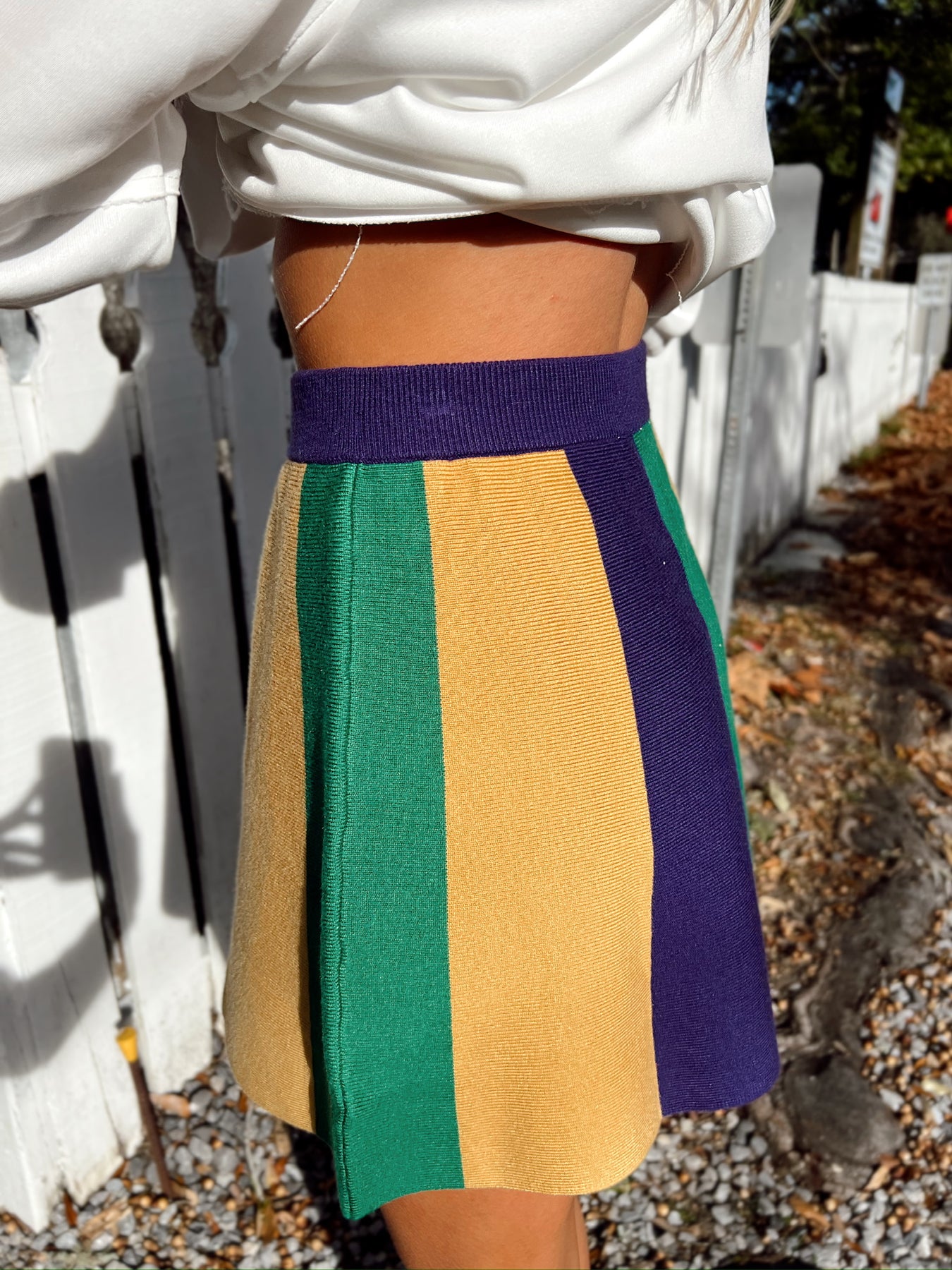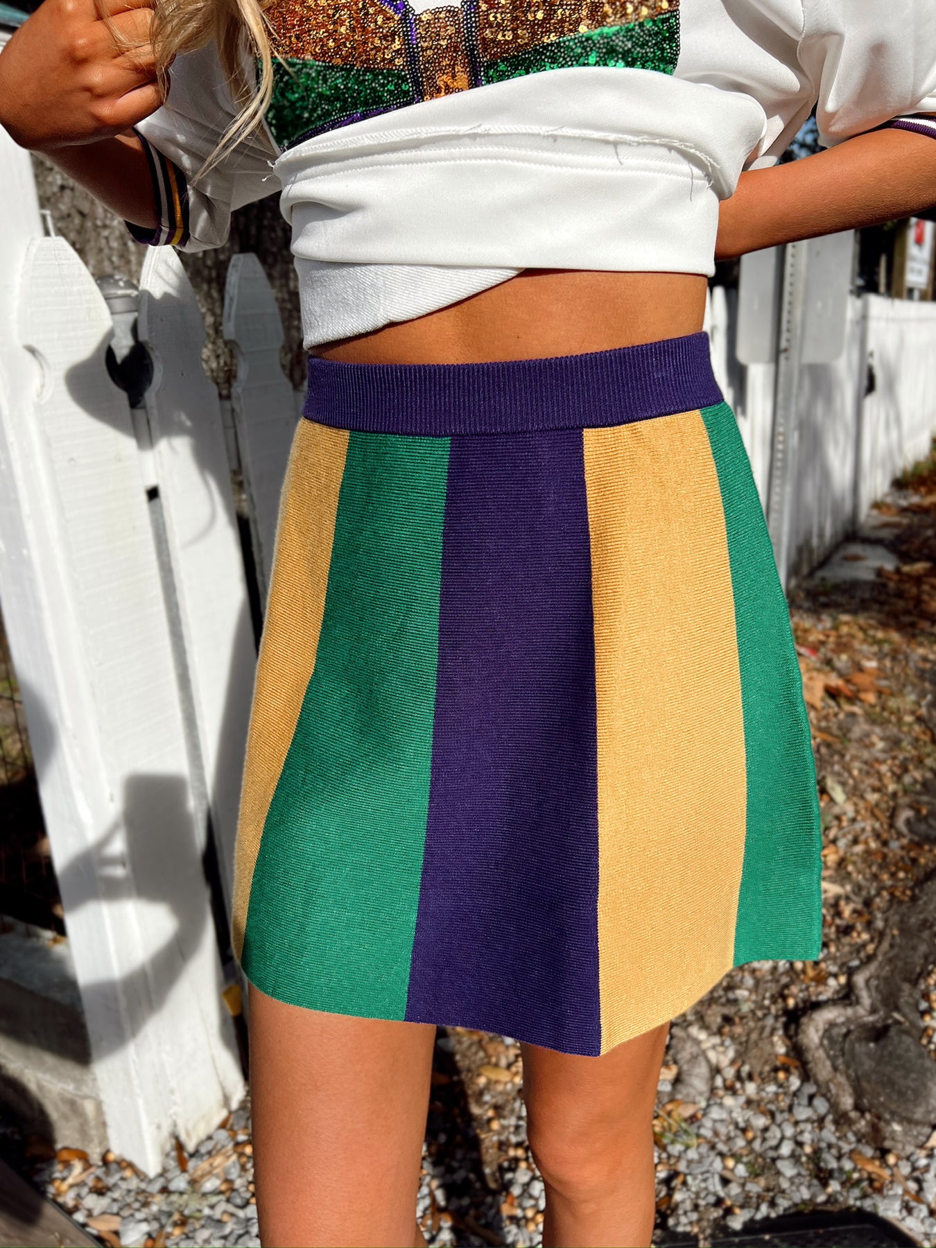 This skirt features elasticized waistband, mardi gras stripe detail, and fitted silhouette.