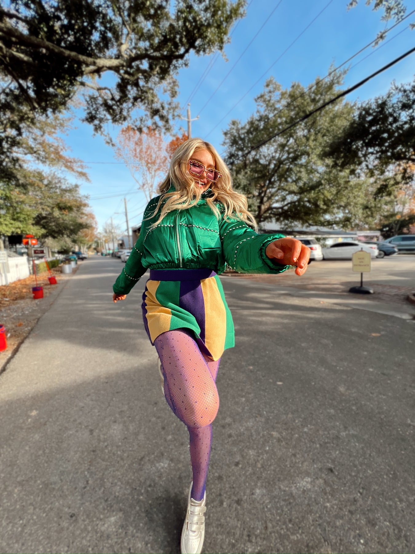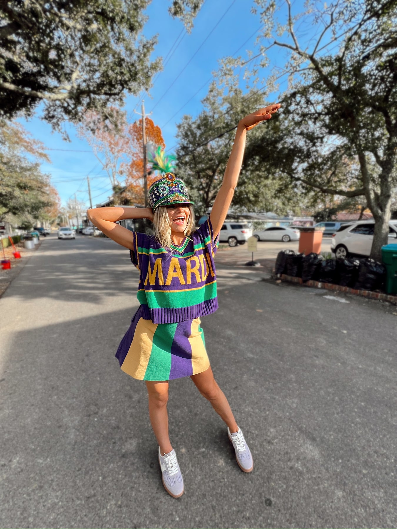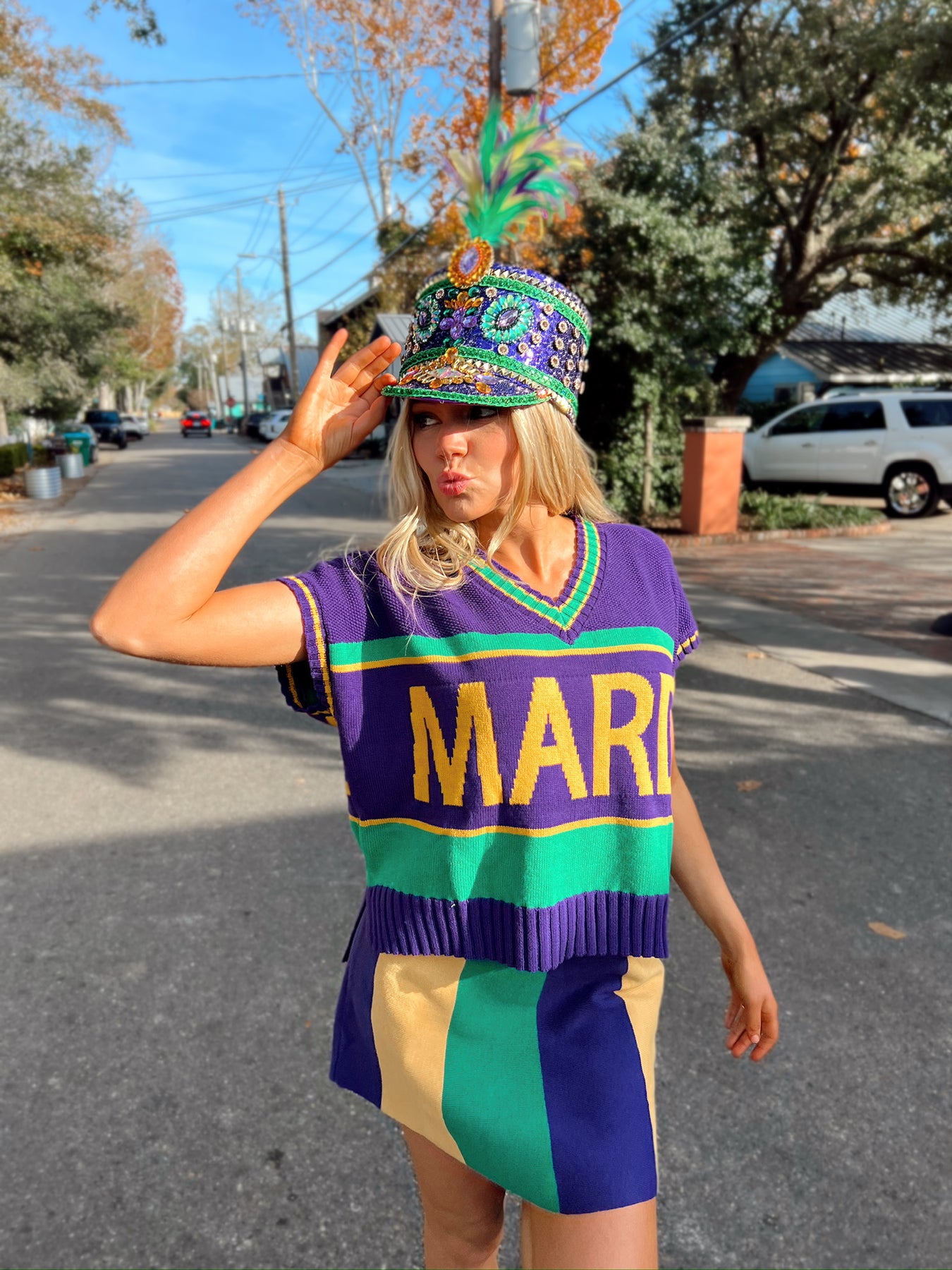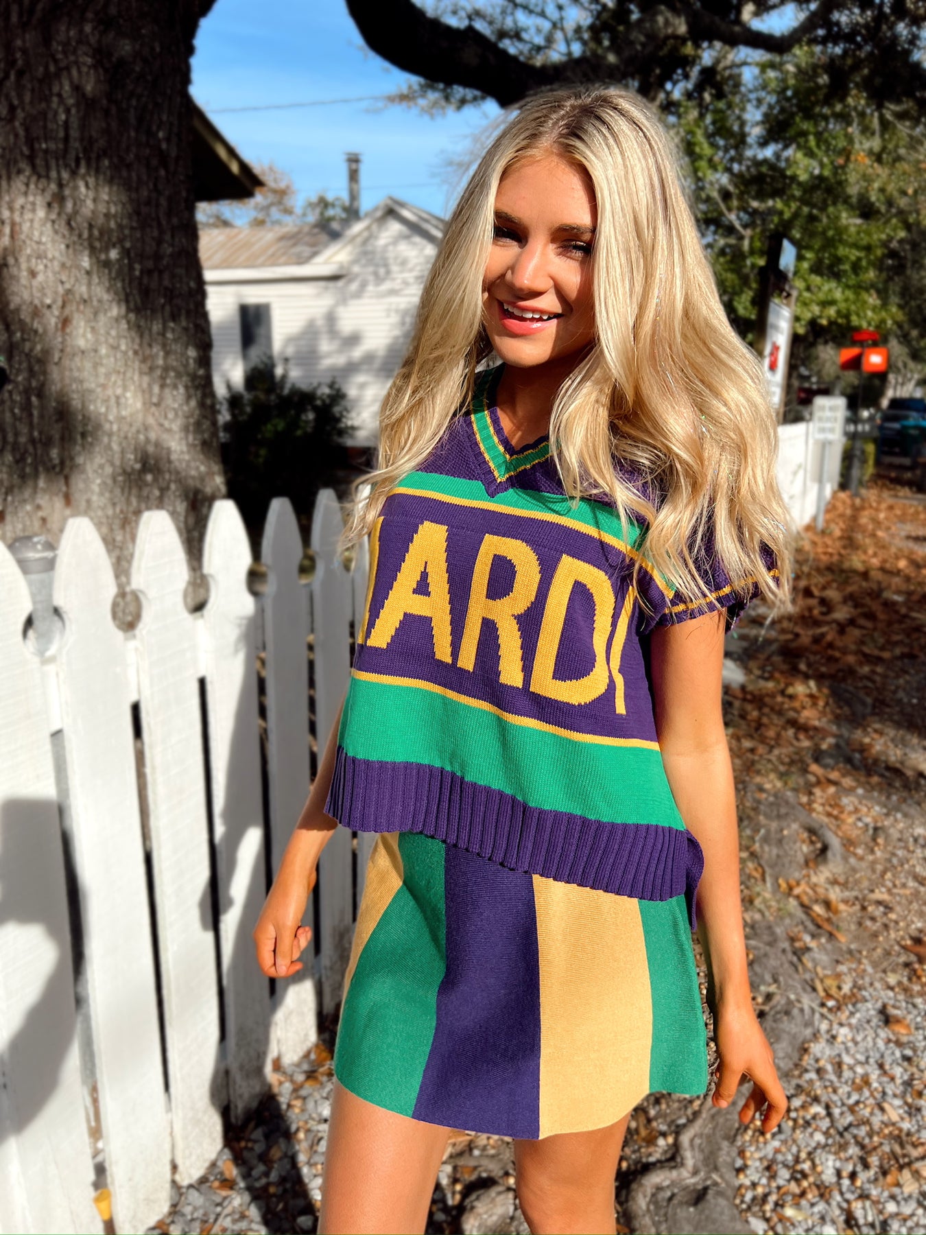 This skirt features elasticized waistband, mardi gras stripe detail, and fitted silhouette.