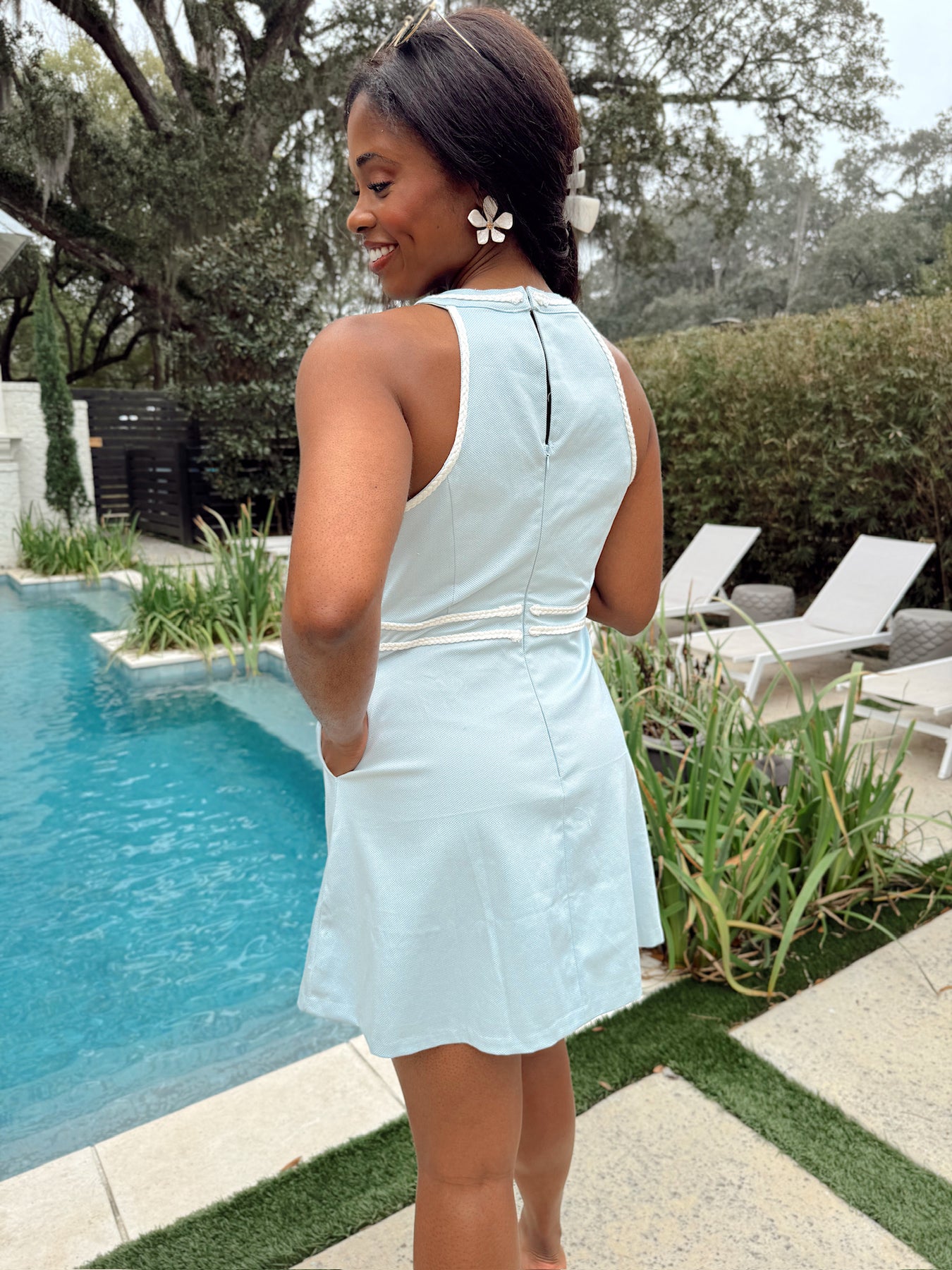 This mini dress features halter neckline, sleeveless cut, hidden back zipper, hidden side pockets, ric rac trim detailing, and lined.