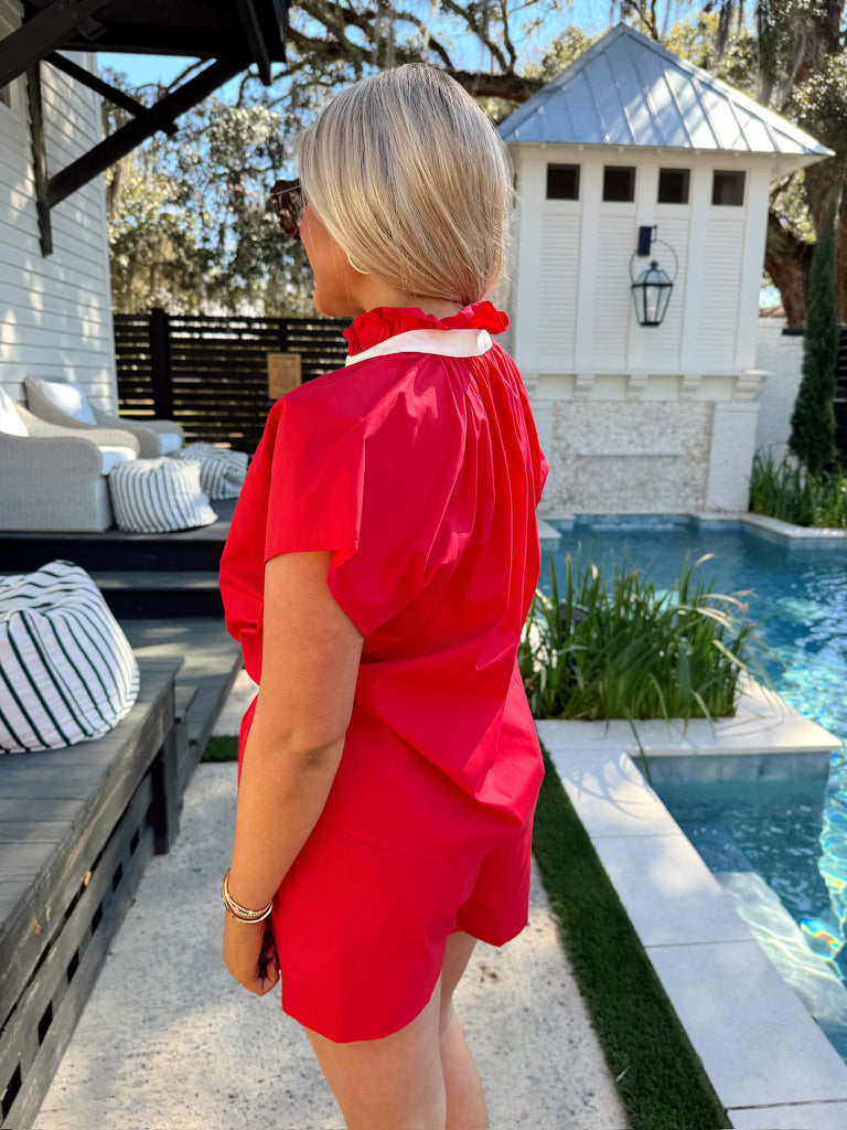 This top features mock neck collar with ruffled trim details, white contrast detail v-neckline, short sleeves, pleated detail around the neckline, and relaxed fit.