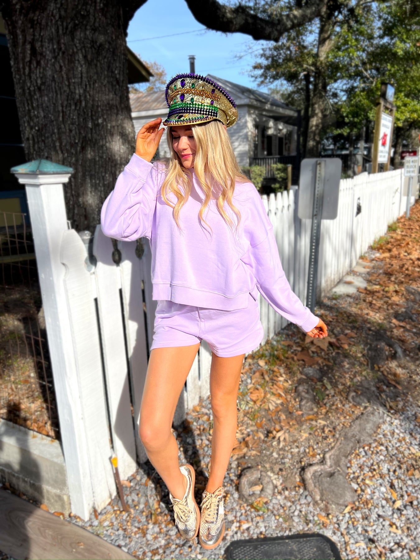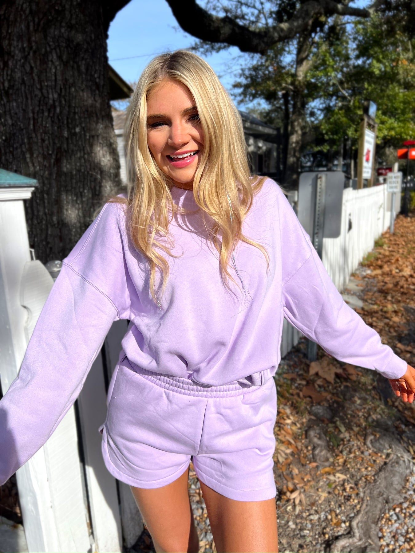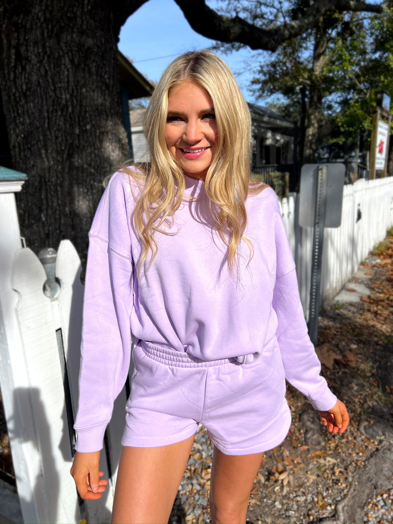 The matching dolphin shorts features minor side slit, side pockets, and elasticized waistband.