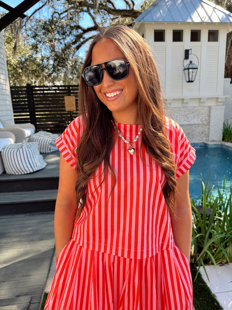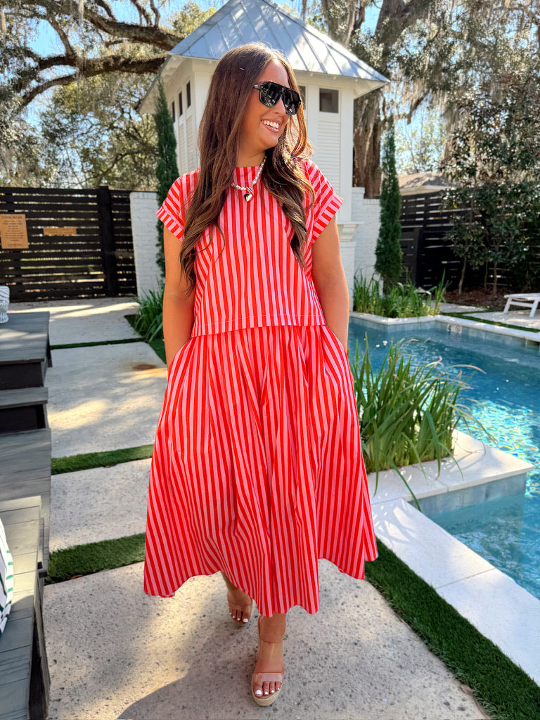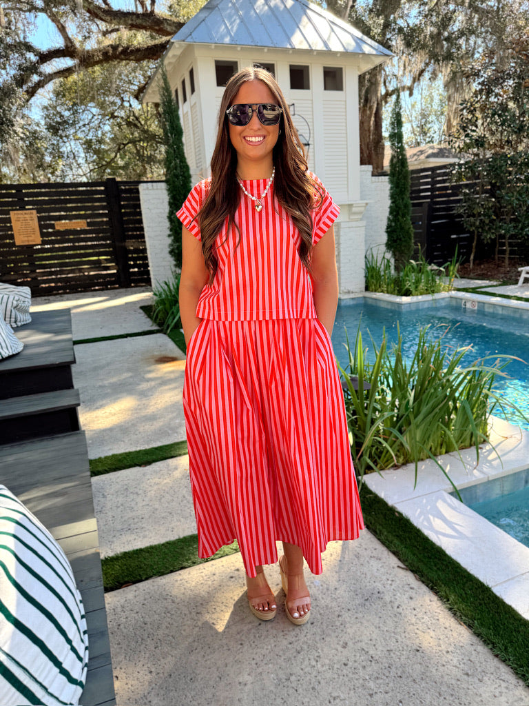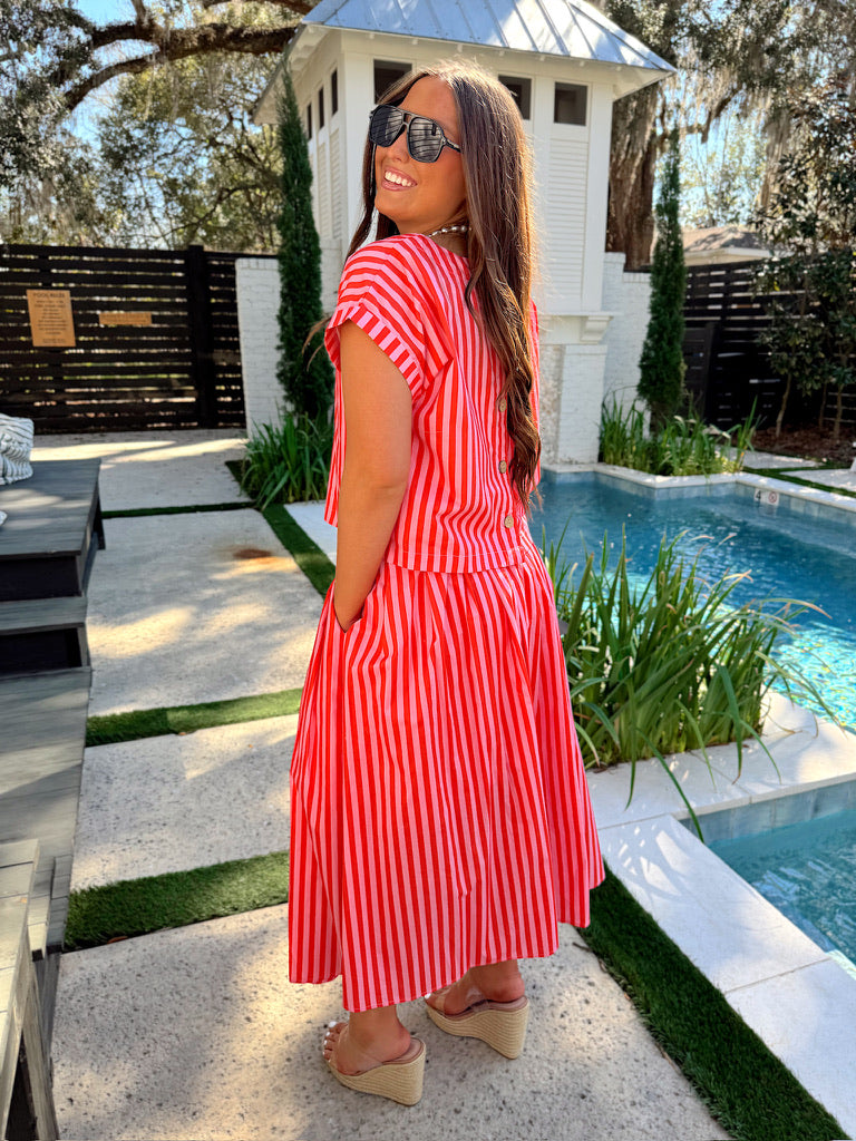 The bottom features midi skirt, stripe details all over, hidden side zipper, two hidden pockets, and lined.