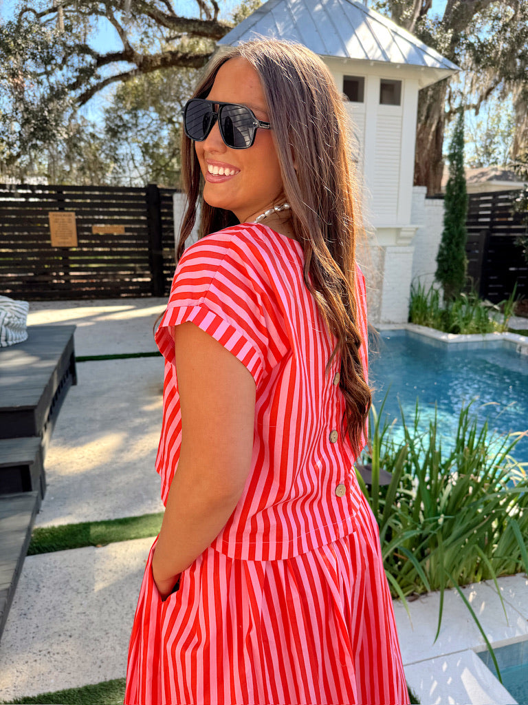 This top features round neckline, relaxed short sleeves, stripe details all over, full back button closures, and relaxed fit.
