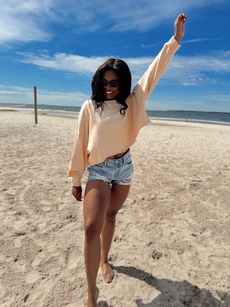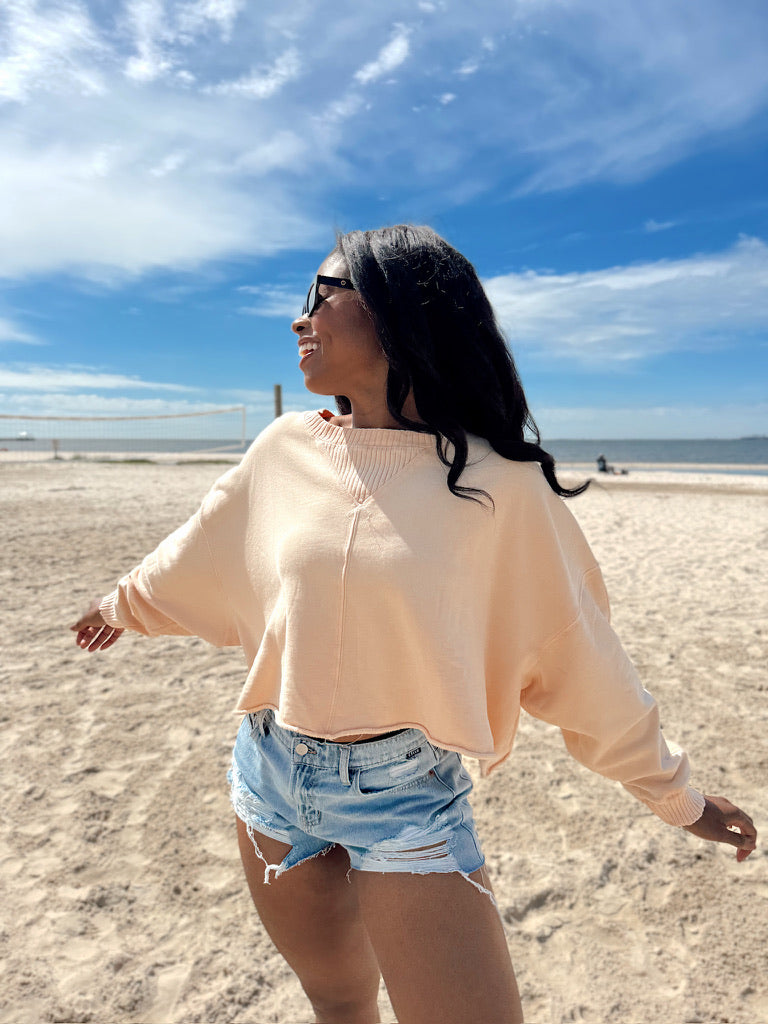 This sweatshirt features crew neckline, long sleeve with ribbed cuffs, raw and rolled hemline, and slight cropped fit.