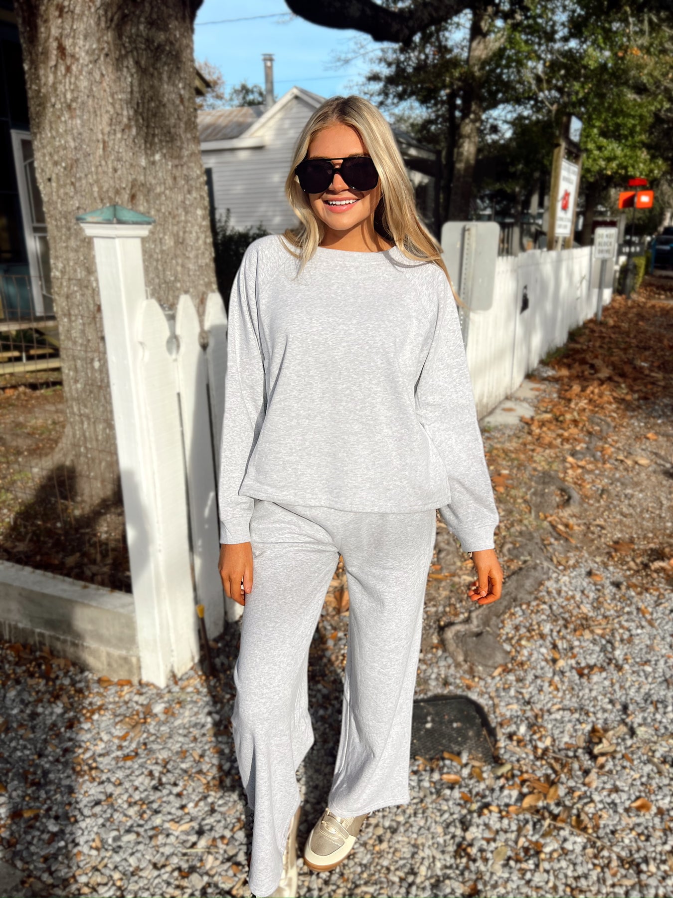 The matching pants features wide leg fit, elasticized waistbands, and side pockets.