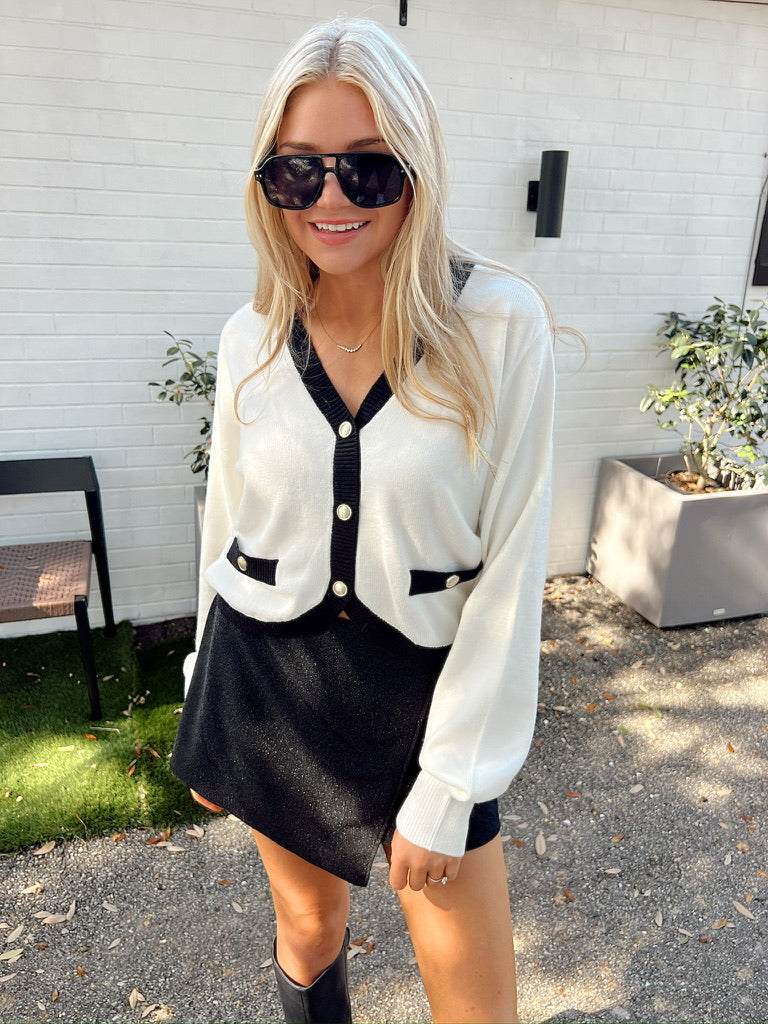 This cardigan features v-neckline, long sleeves, black contrast detail, gold button front closures, faux pocket with gold buttons, and scoop hemline.
