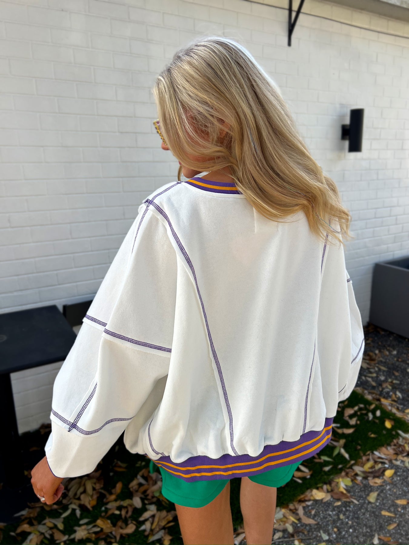 This sweatshirt features color contrast crew neckline, long sleeves, varsity-style appliqué letters "Mardi Gras", inside-out stick detailing, color contrast cuffs, and loose fit.