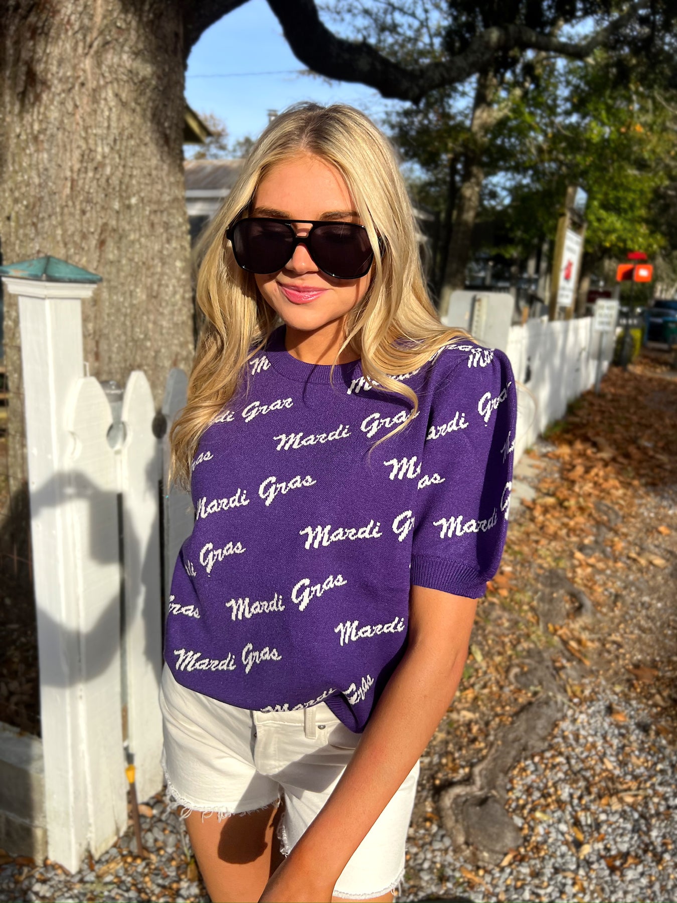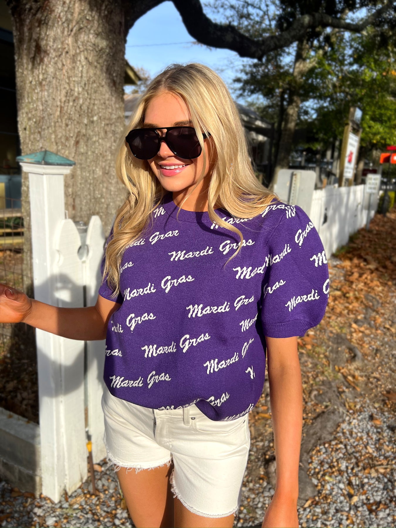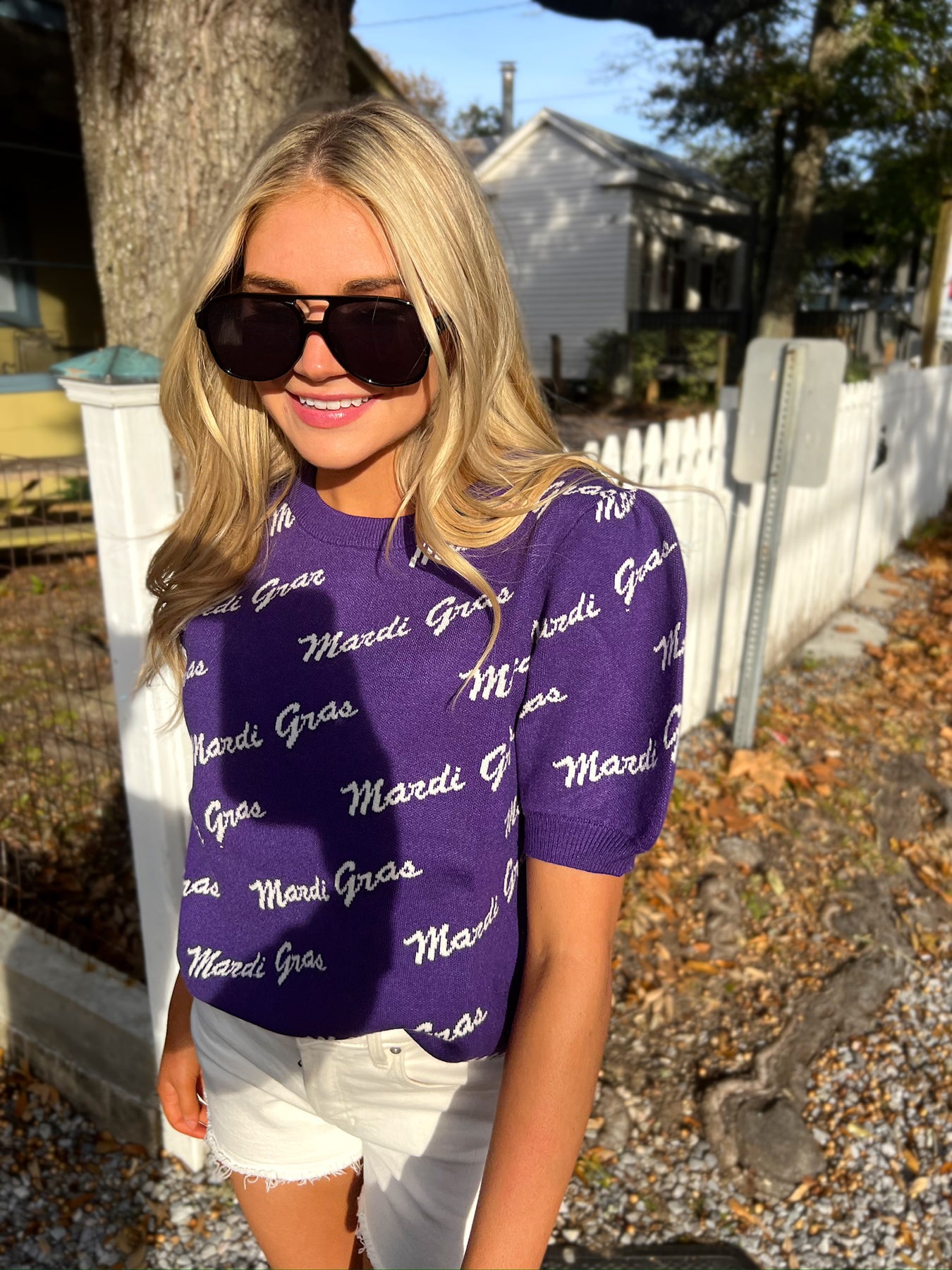 This top features round neckline, short puffy sleeves, and "Mardi Gras" in cursive font throughout.