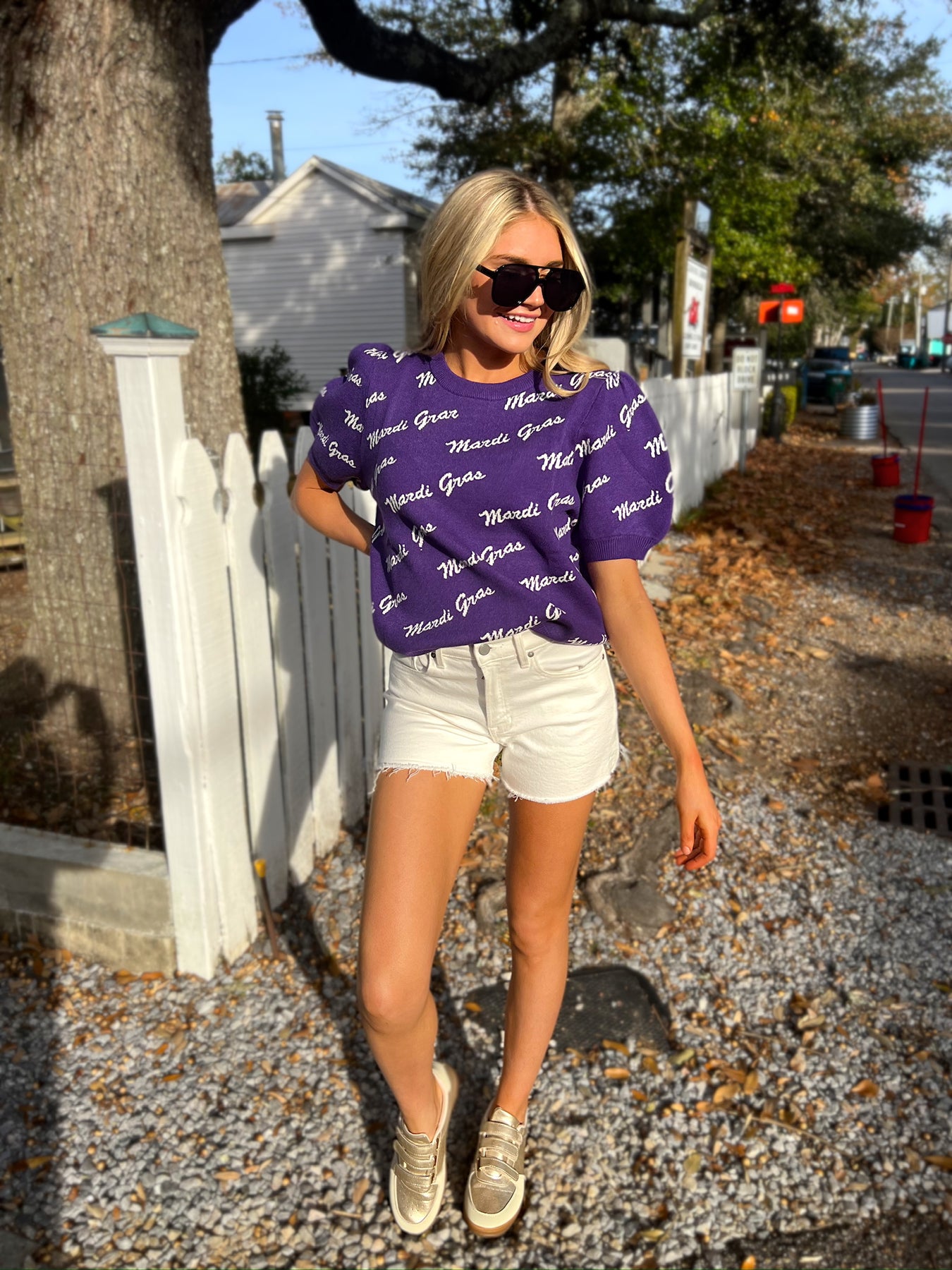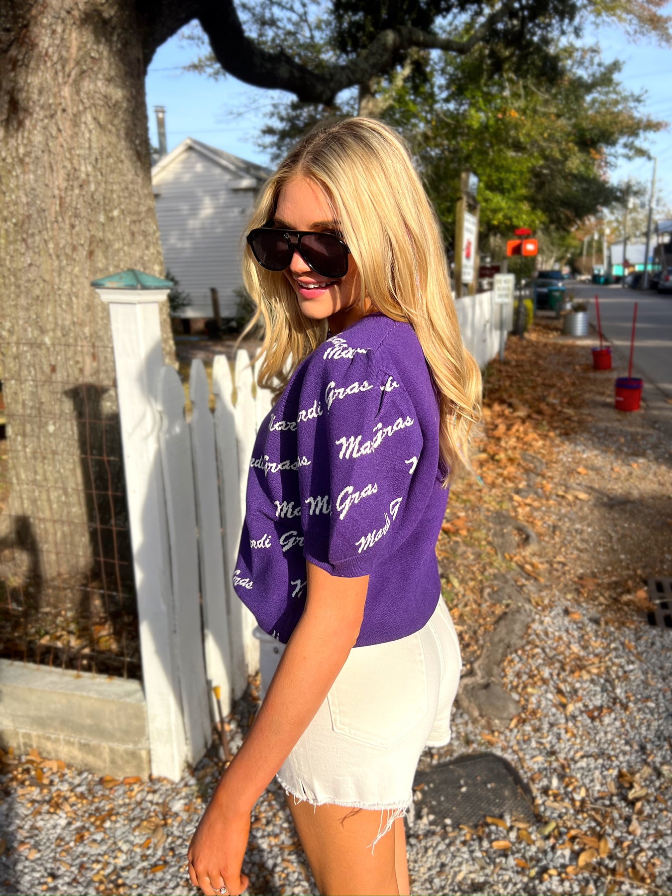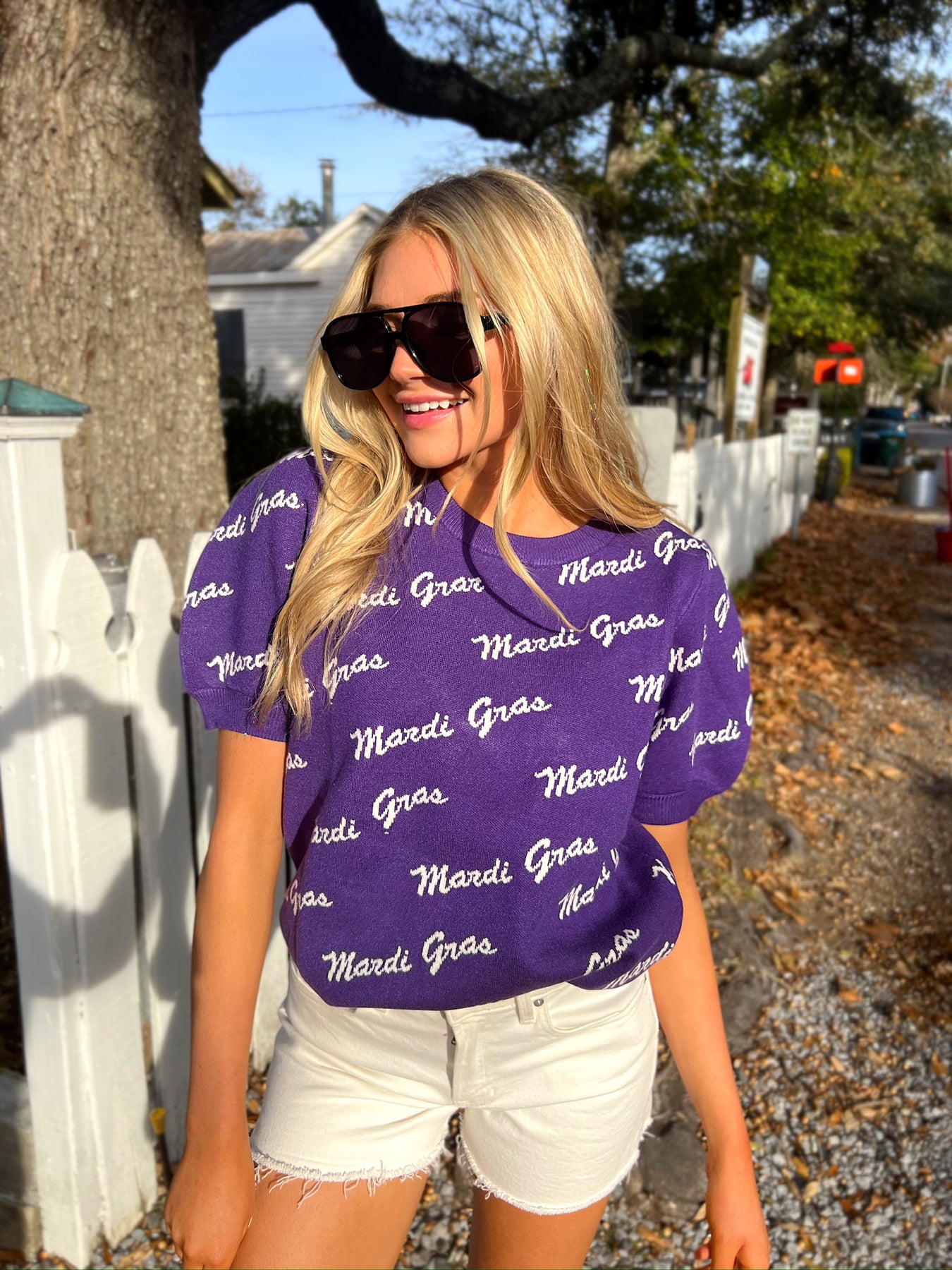 This top features round neckline, short puffy sleeves, and "Mardi Gras" in cursive font throughout.
