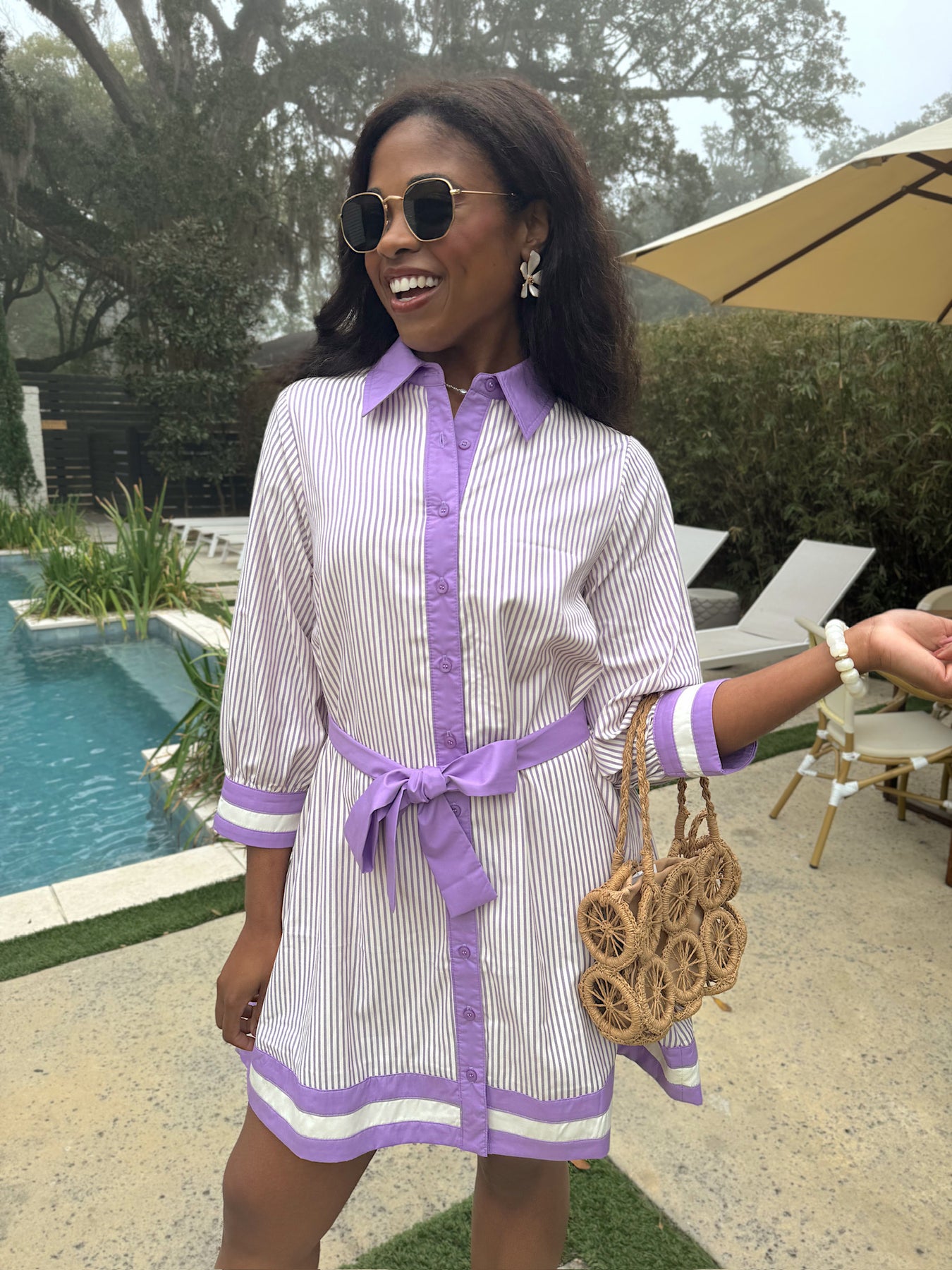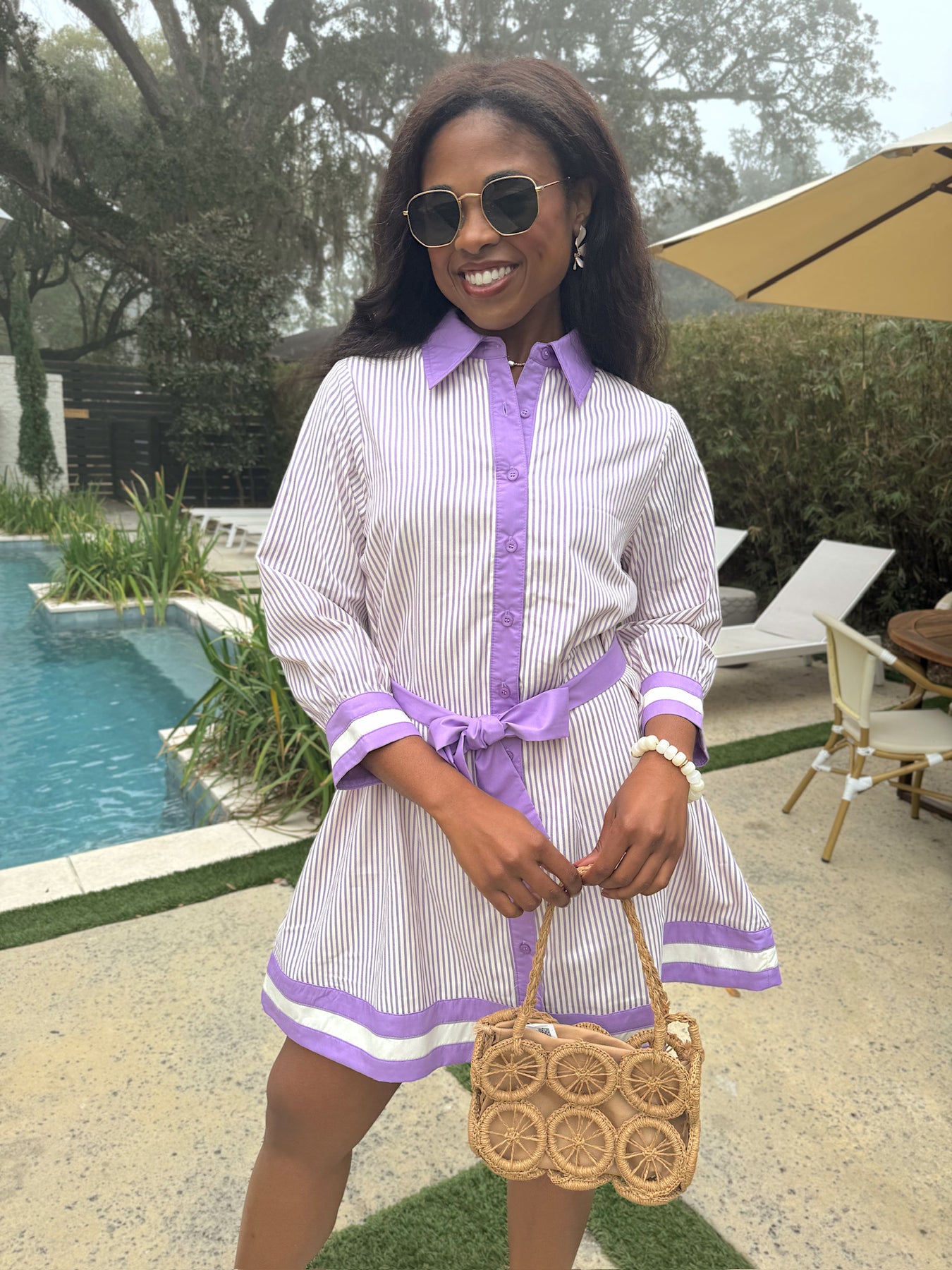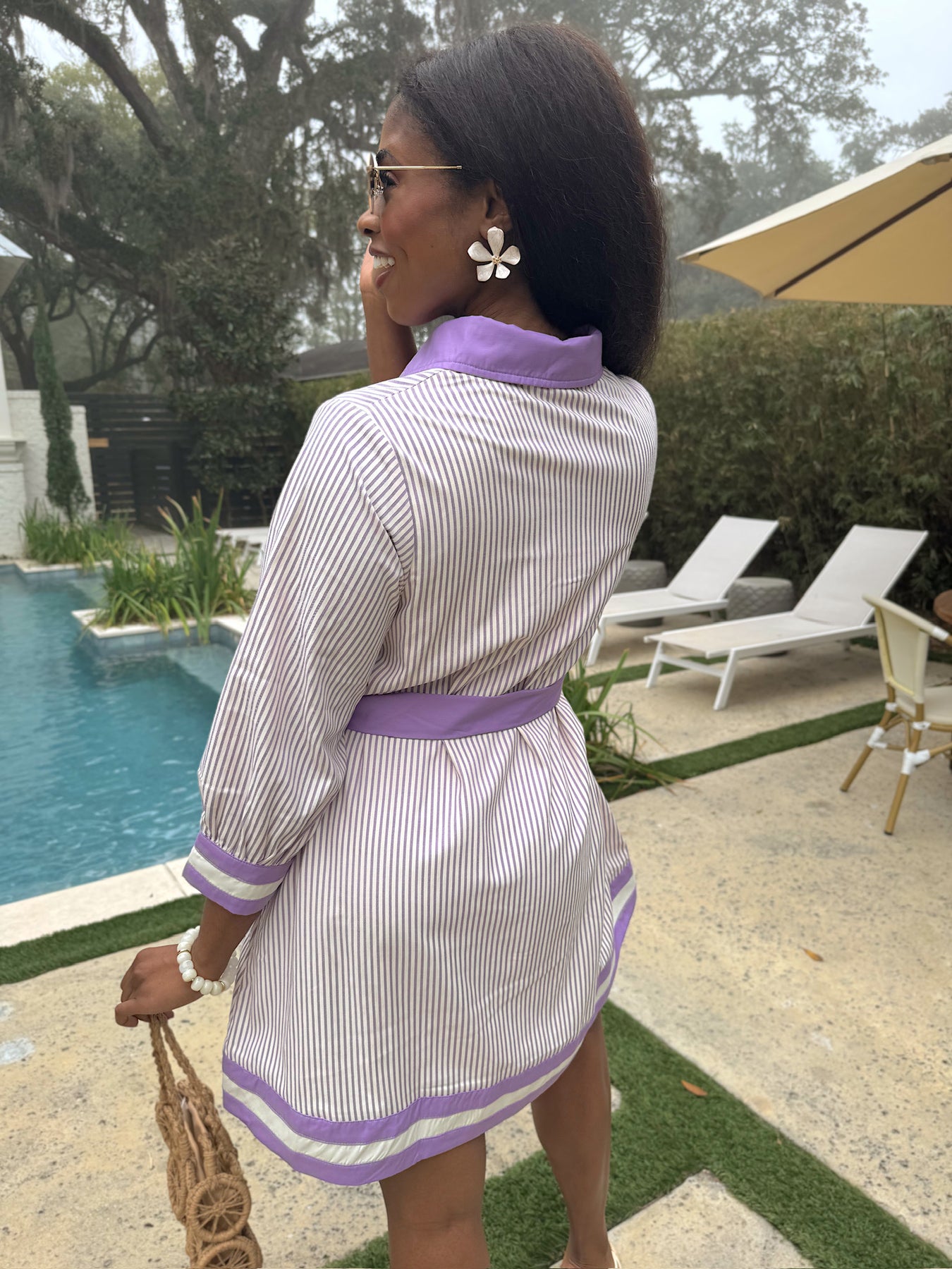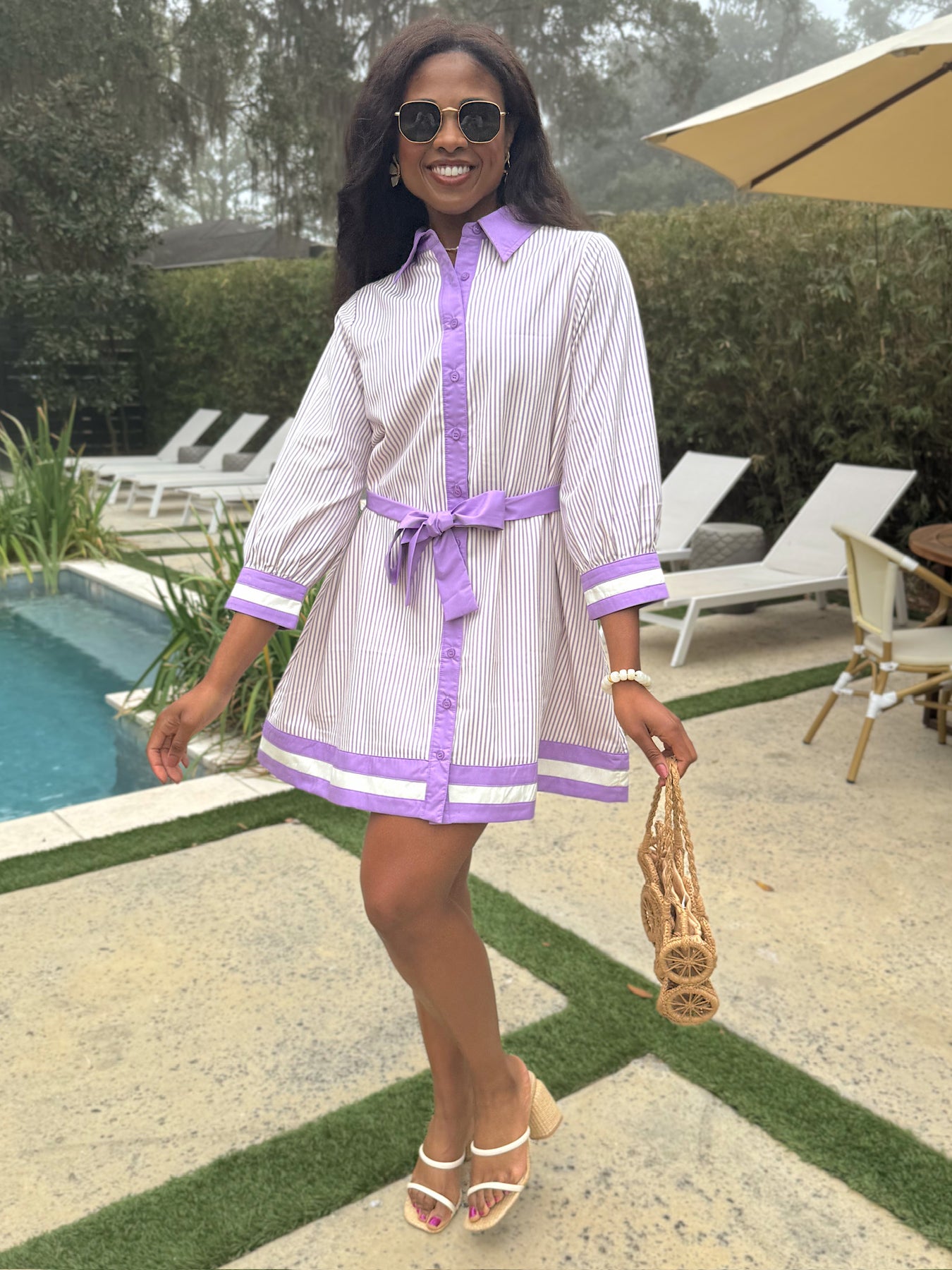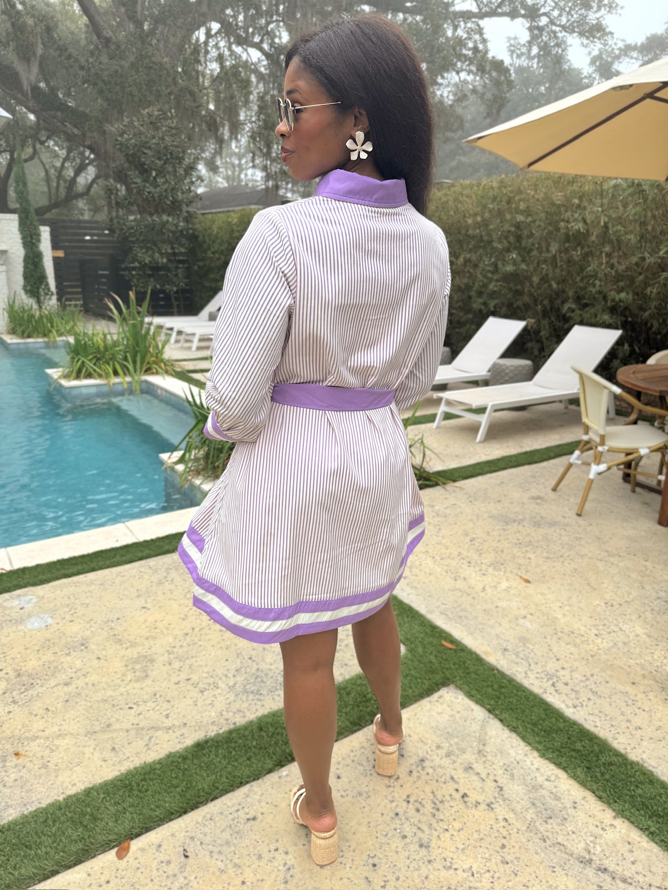This mini dress features a pinstripe print, contrasting trim on cuff and hem. It has a button-down front opening and a self-tie belt.