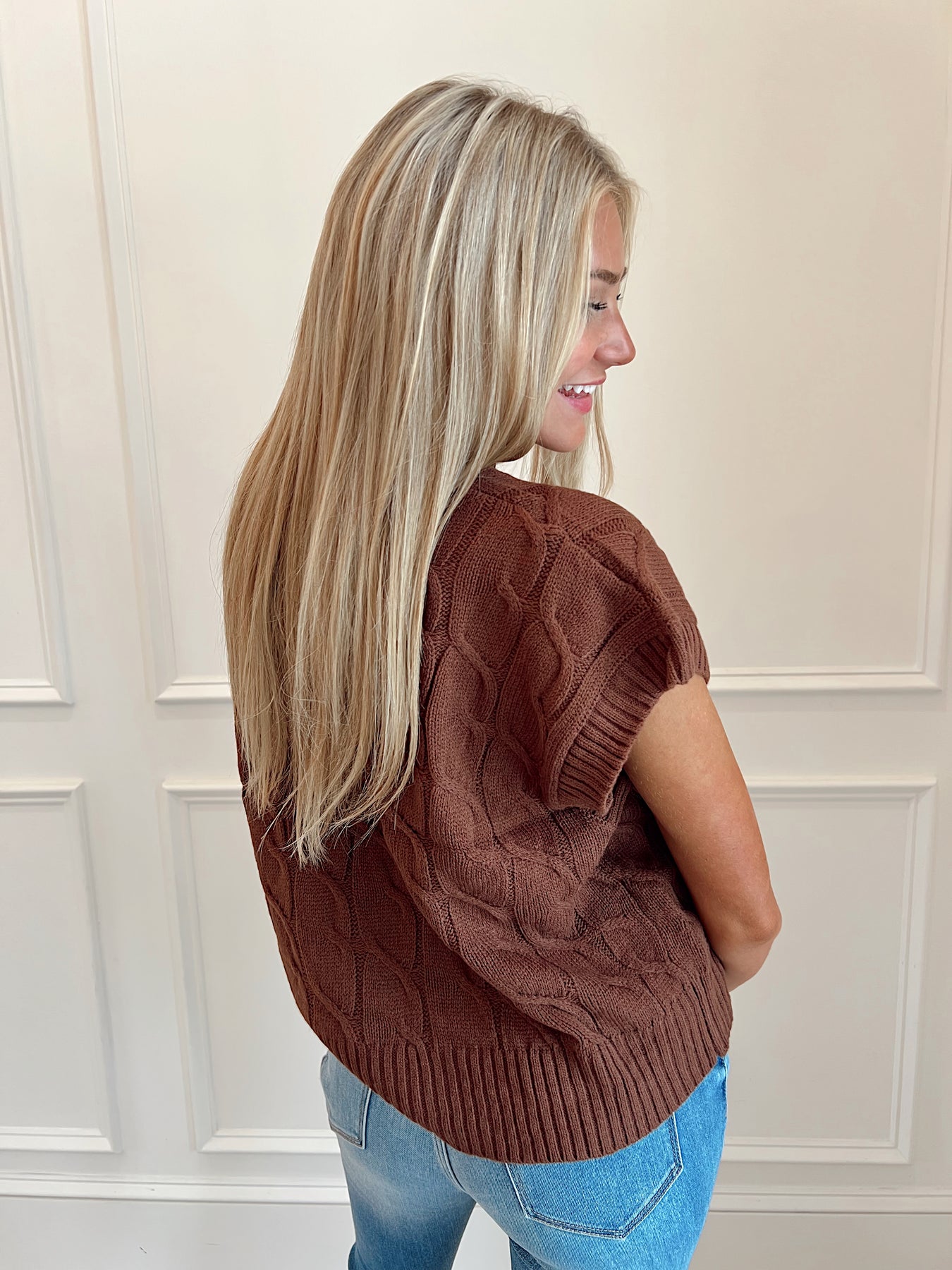 This top features ribbed hemlines, short sleeves, round neckline, cable knit pattern, and relaxed fit.