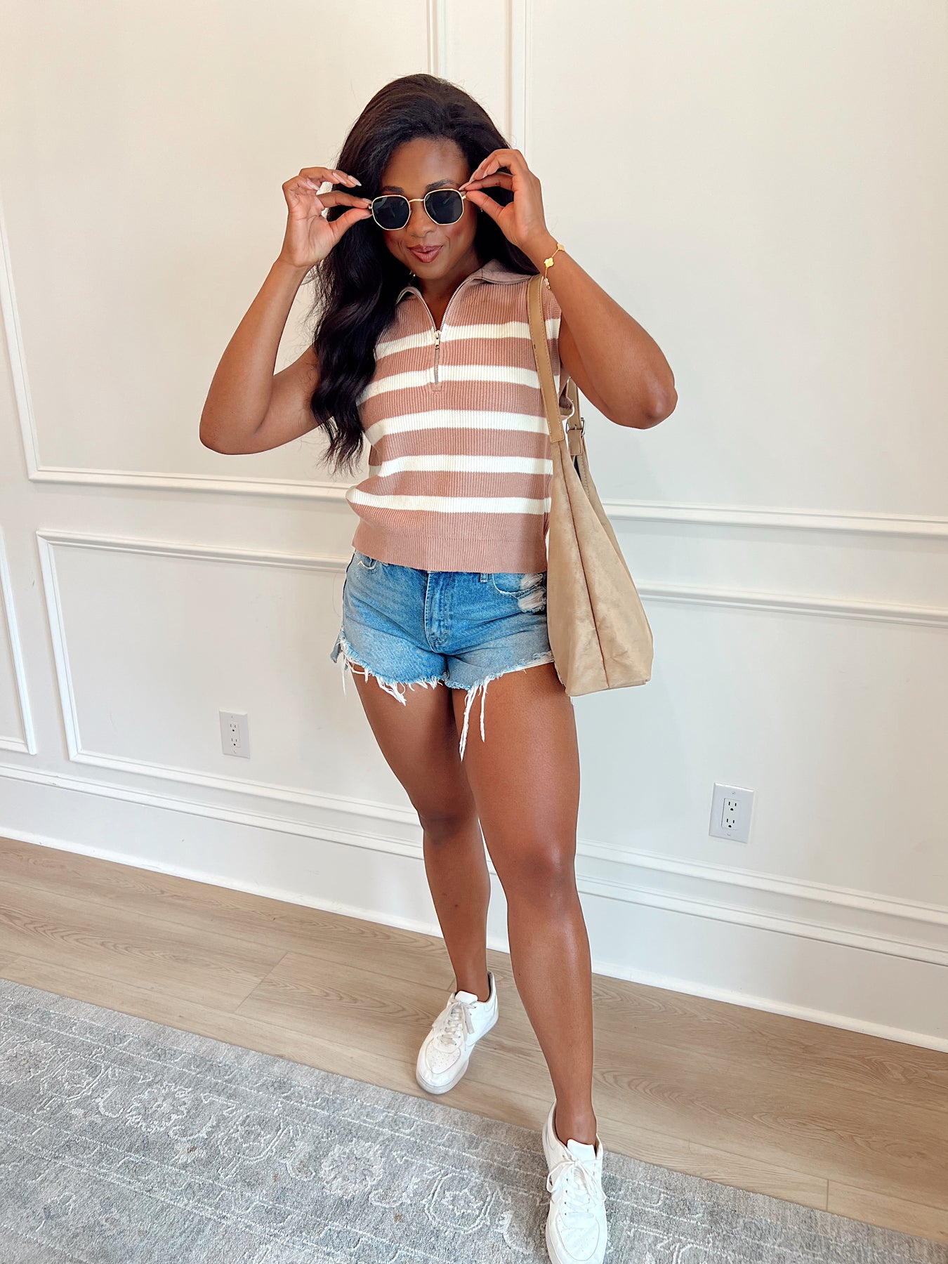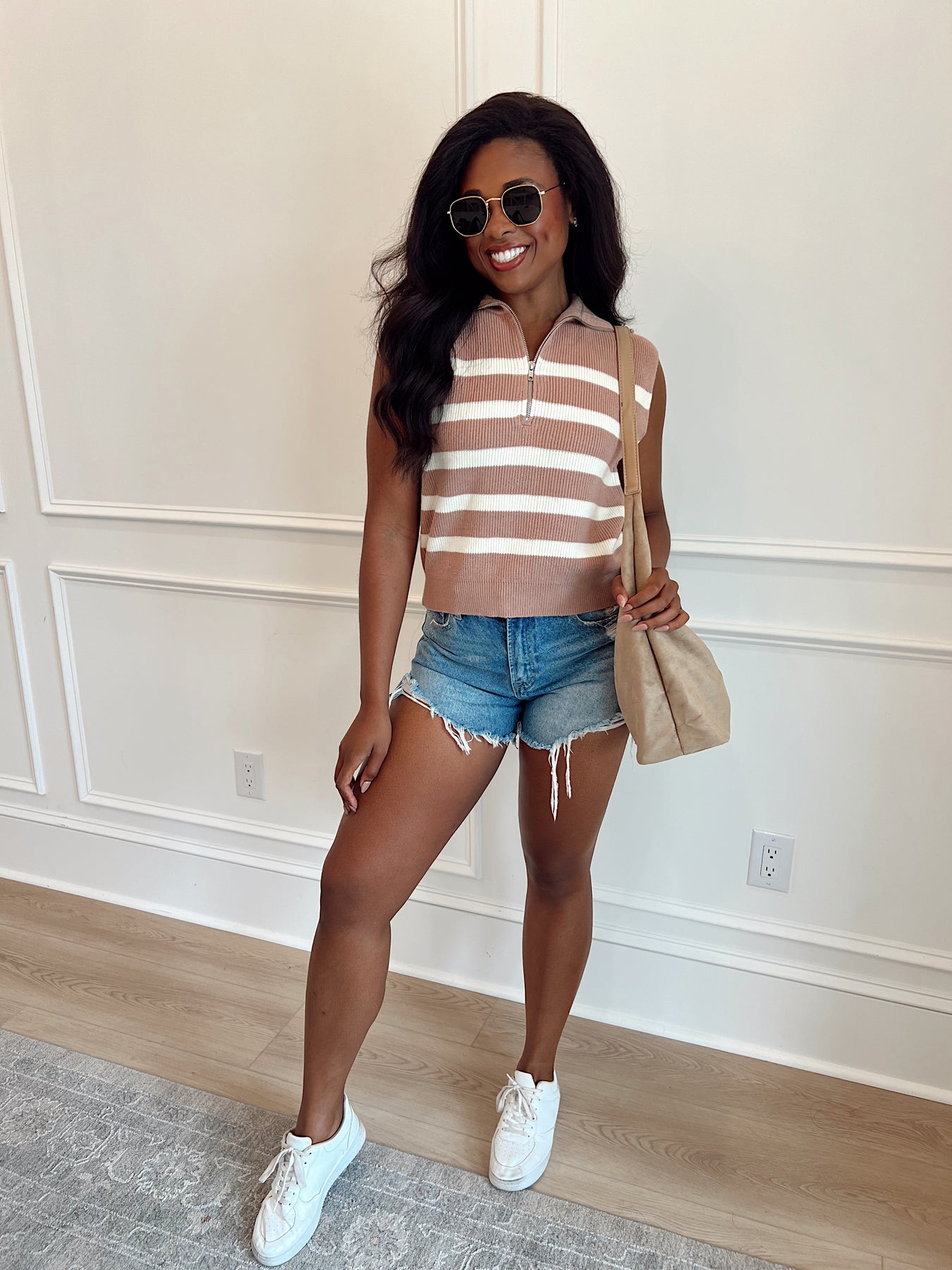 This sweater vest features quarter zip closure, collared neckline, striped pattern, wide sleeveless cut, and semi-relaxed fit.