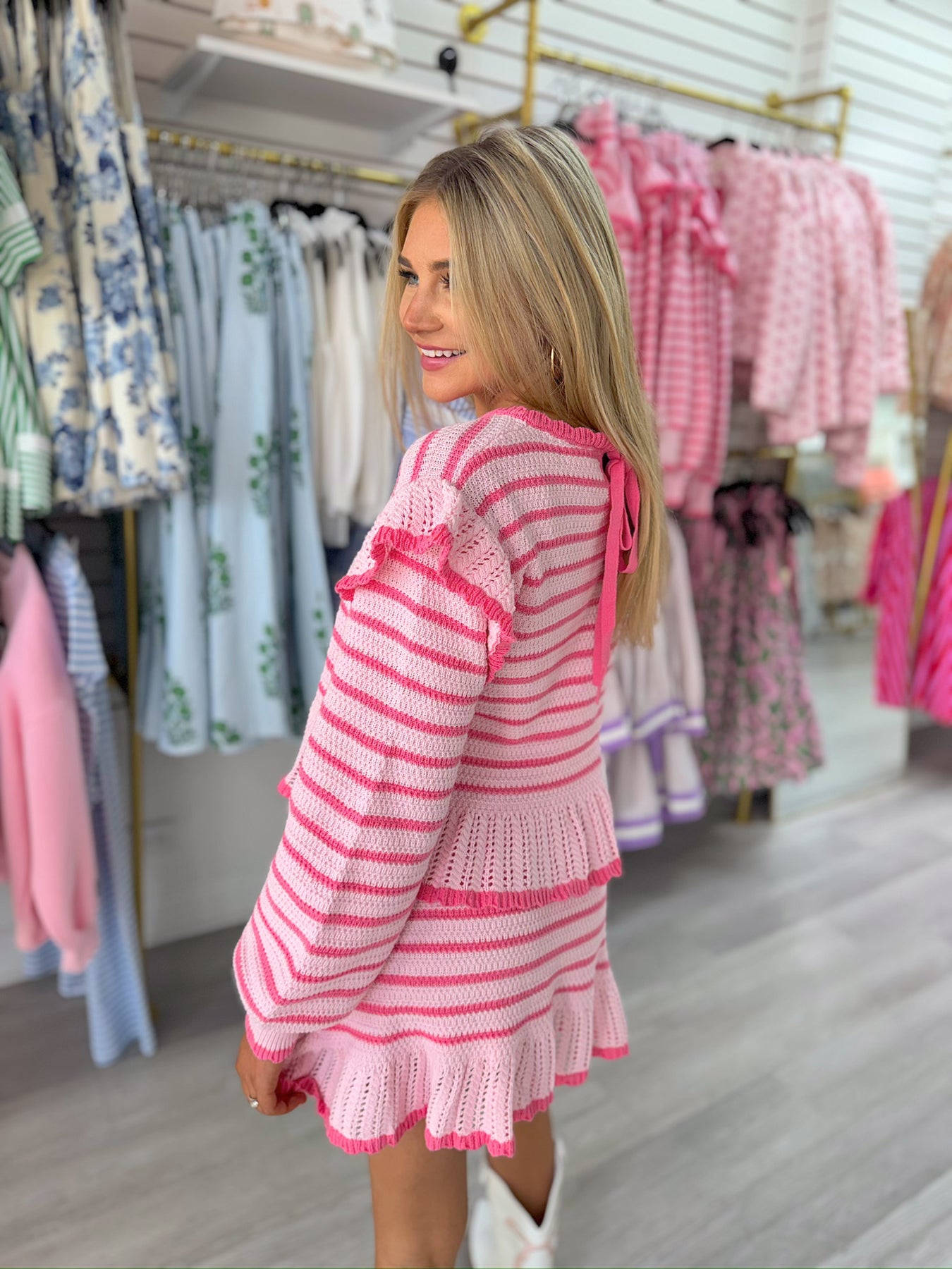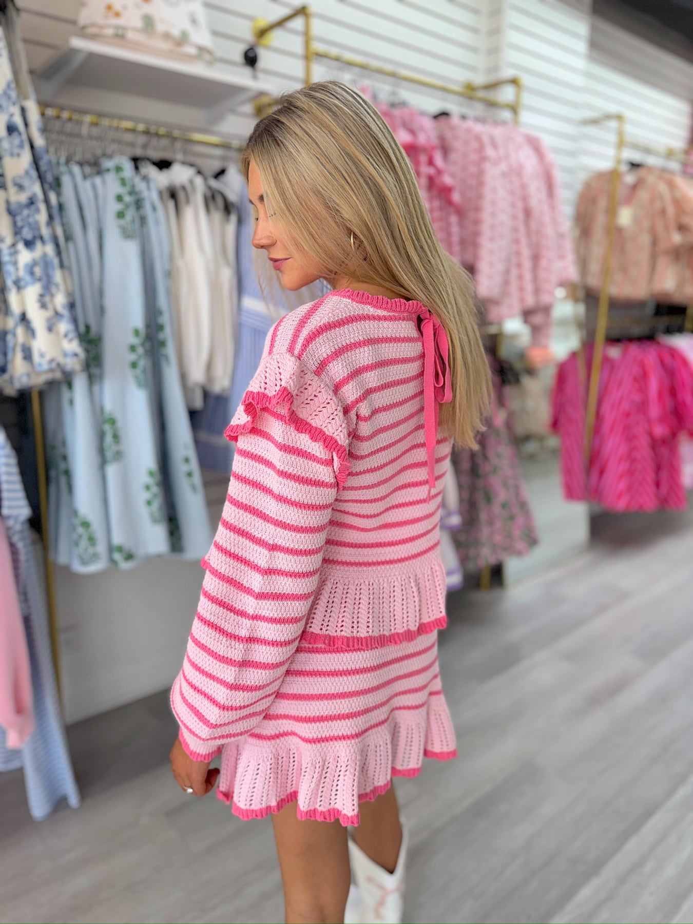 This top features round neckline with scalloped trim detail, knit material all over, striped details all over, ruffled detail at the shoulder, wide ribbed cuffs, ruffled skirt detail at the hemline, and back self-tie detail.