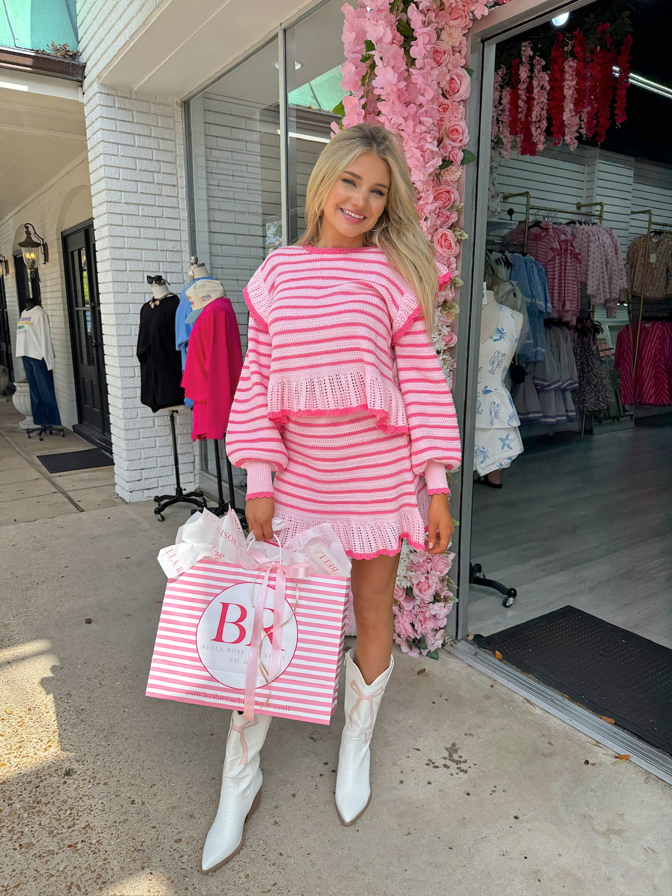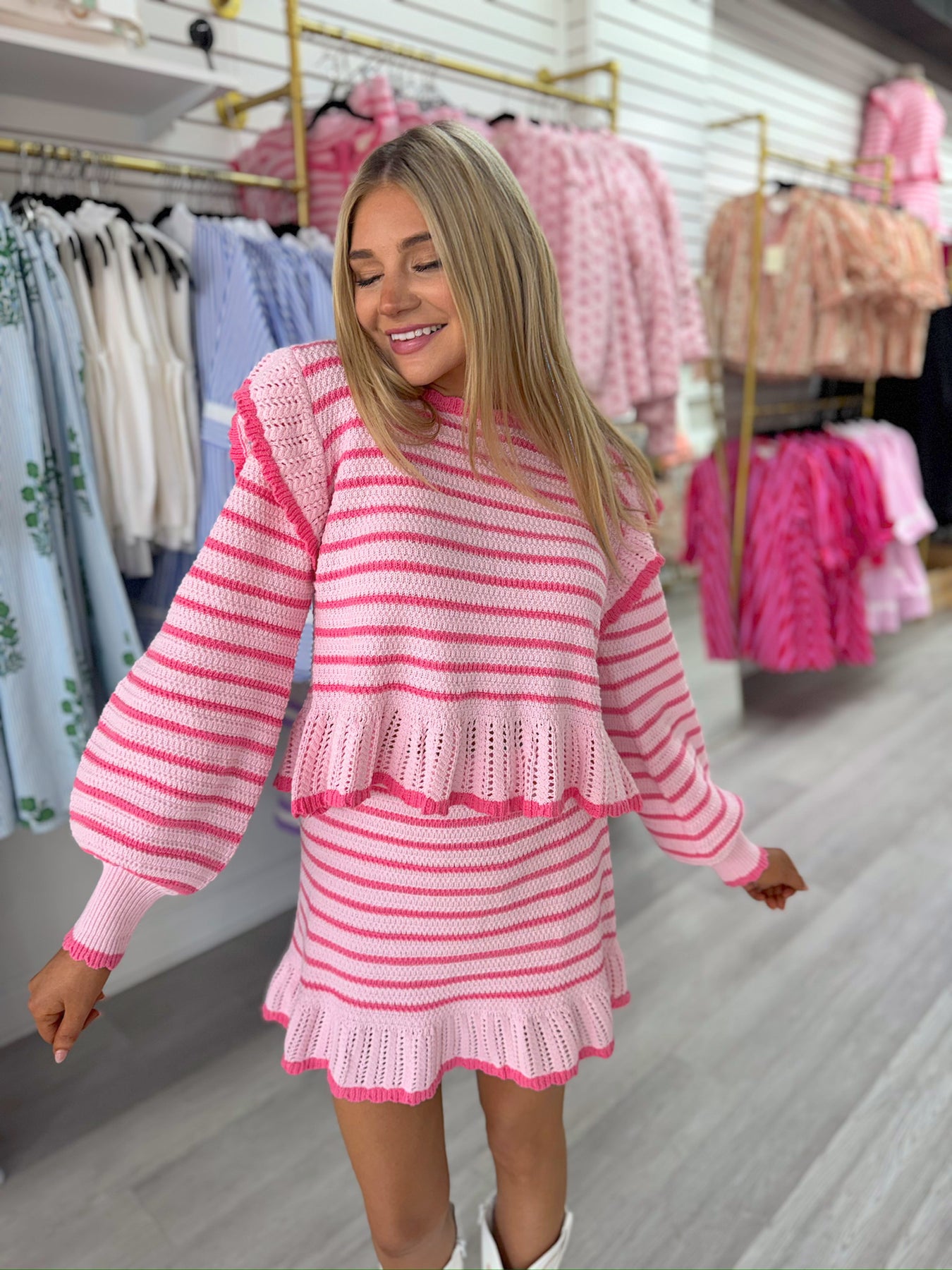 The matching skirt features elasticized waistband, fitted silhouette, single tiered ruffle skirt, knitted material, and striped details all over.