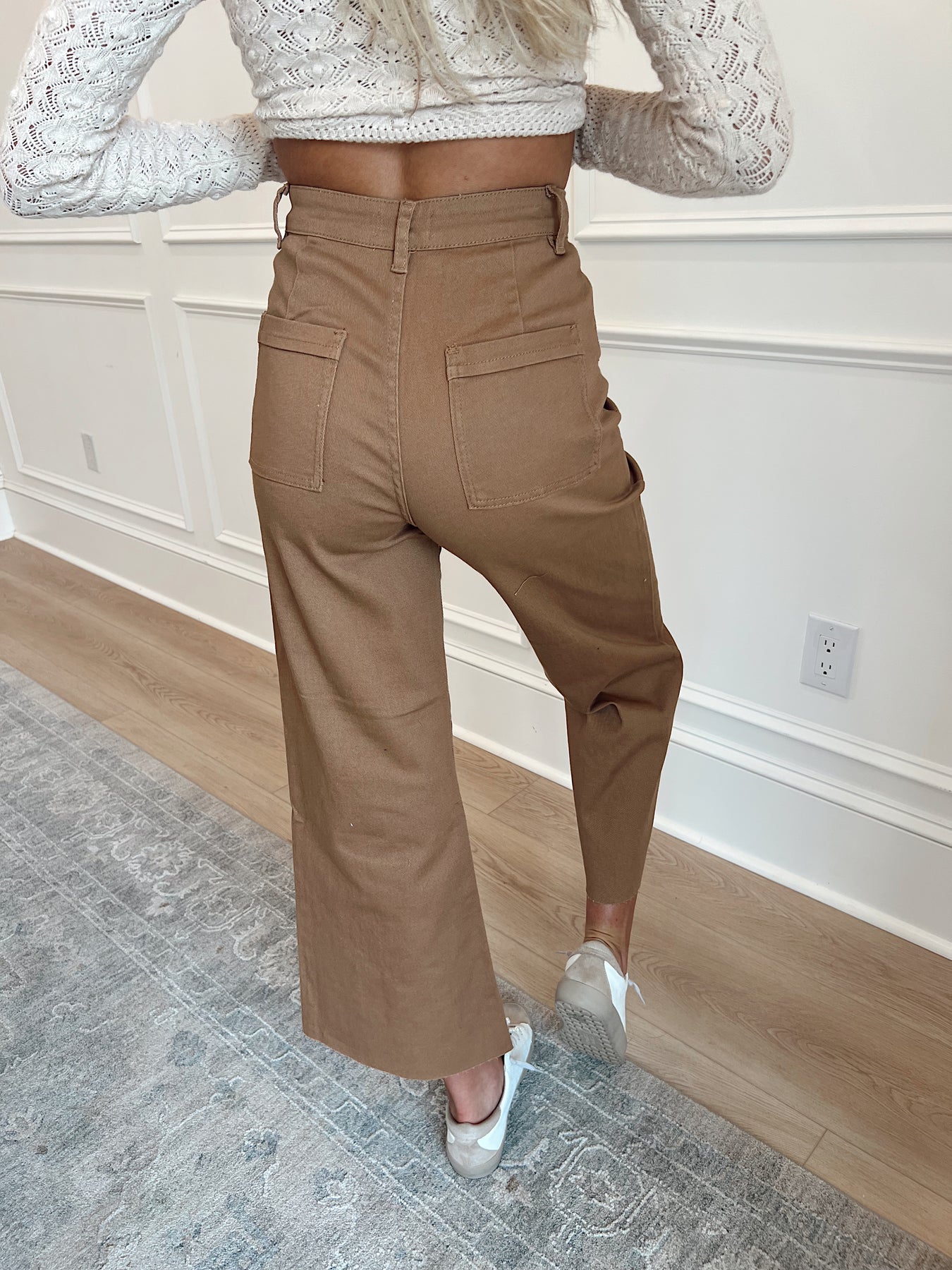 These denim features belt loops, front zipper/button closure, two back patch pockets, wide leg fit, raw hemline, and high waisted.