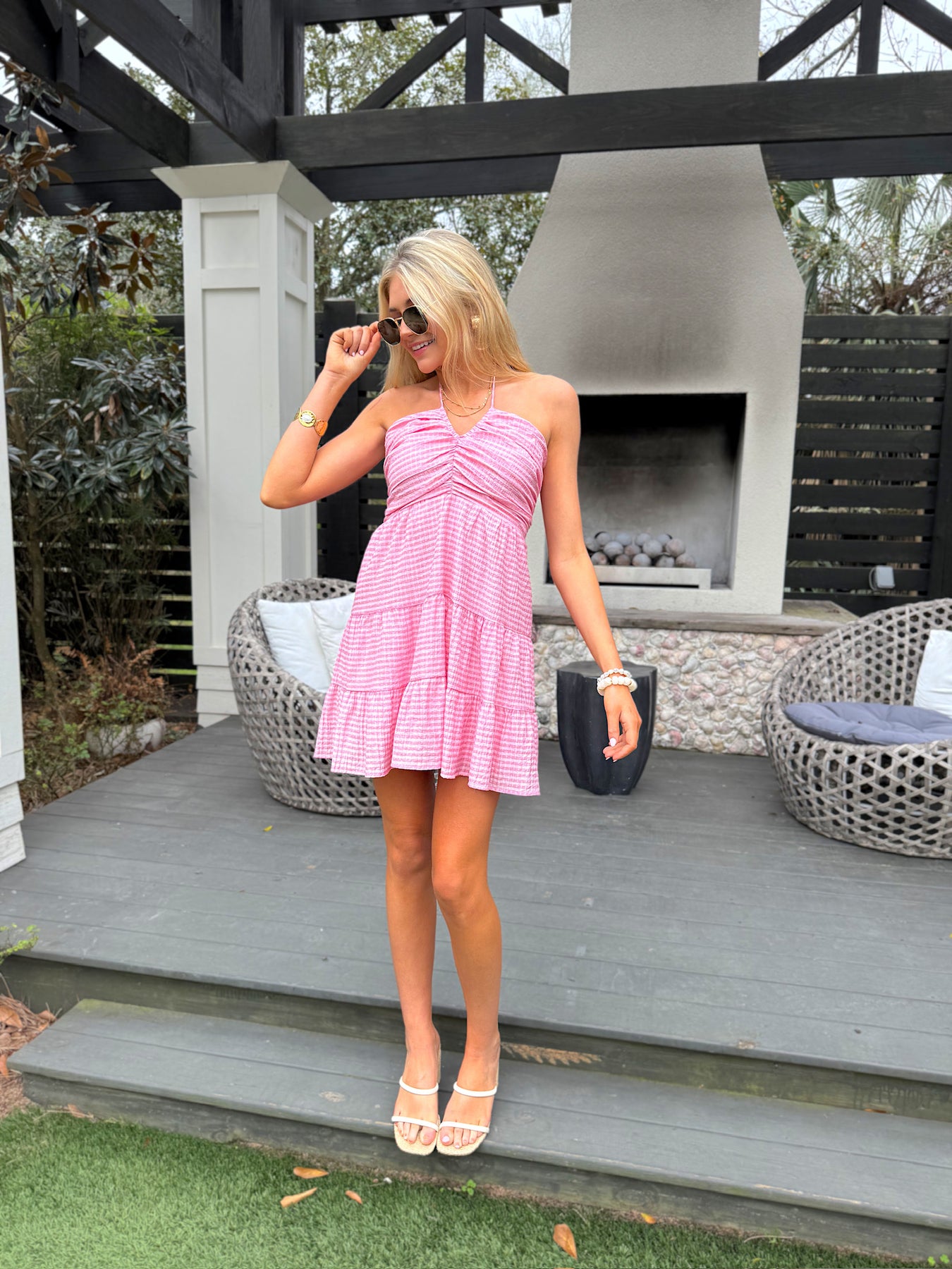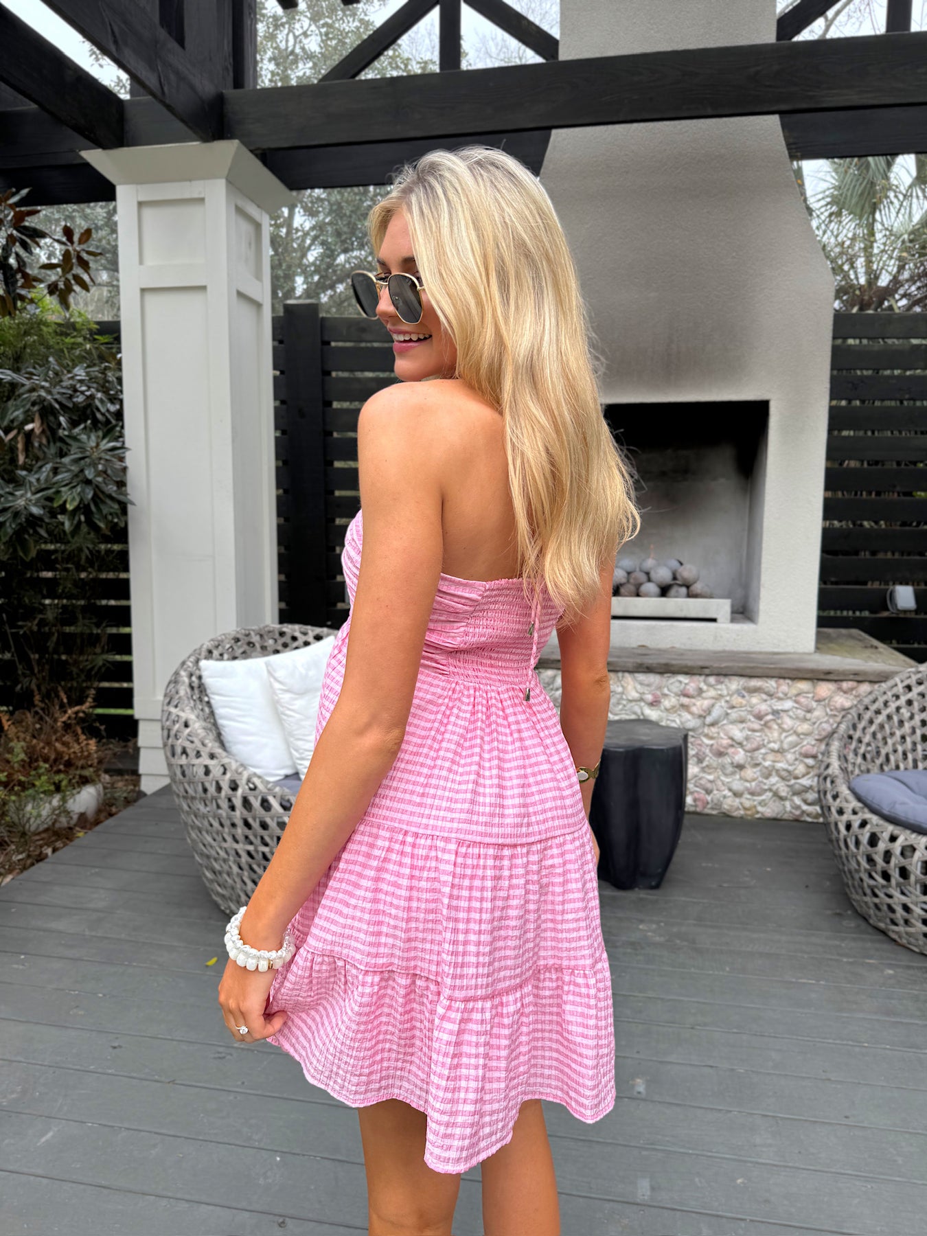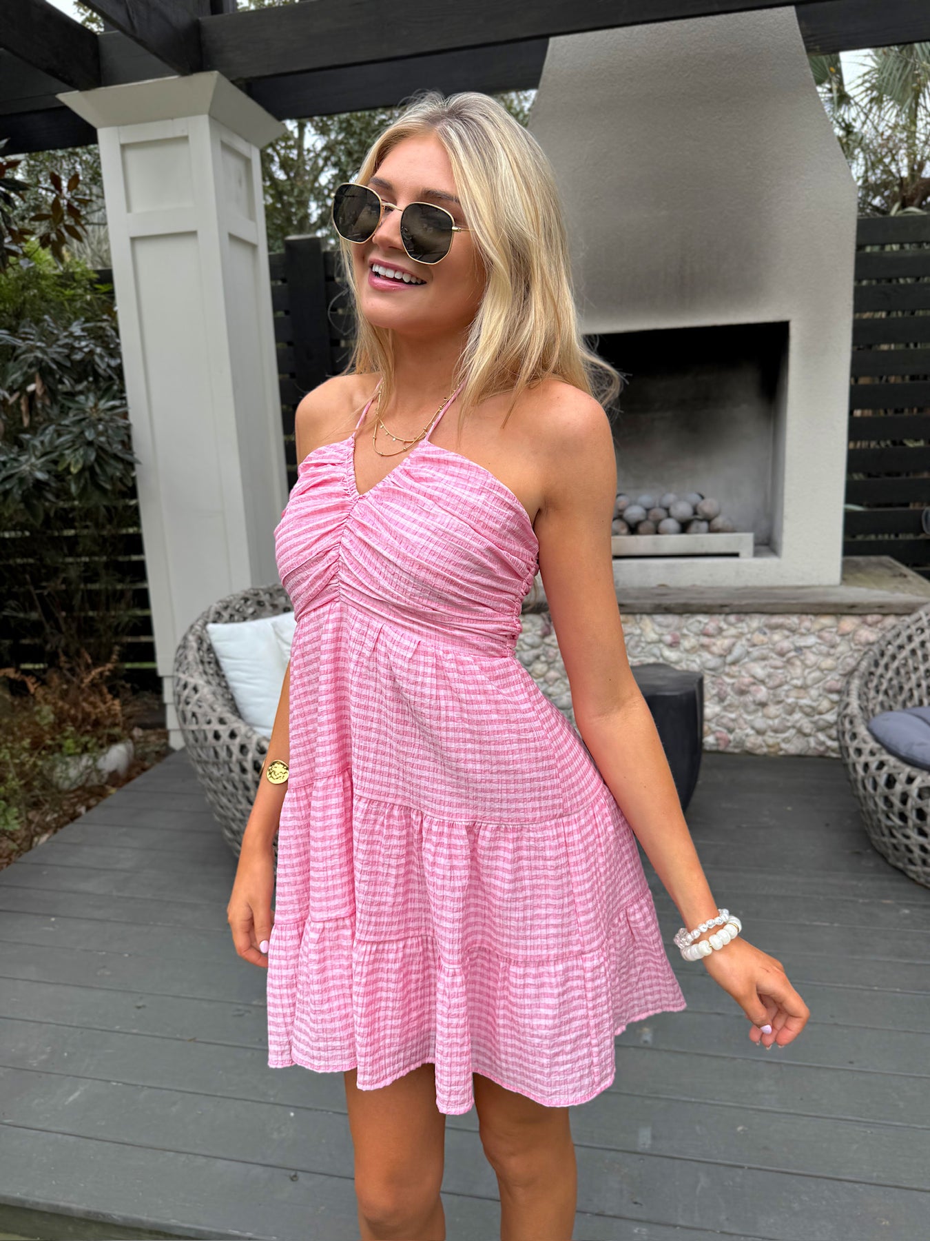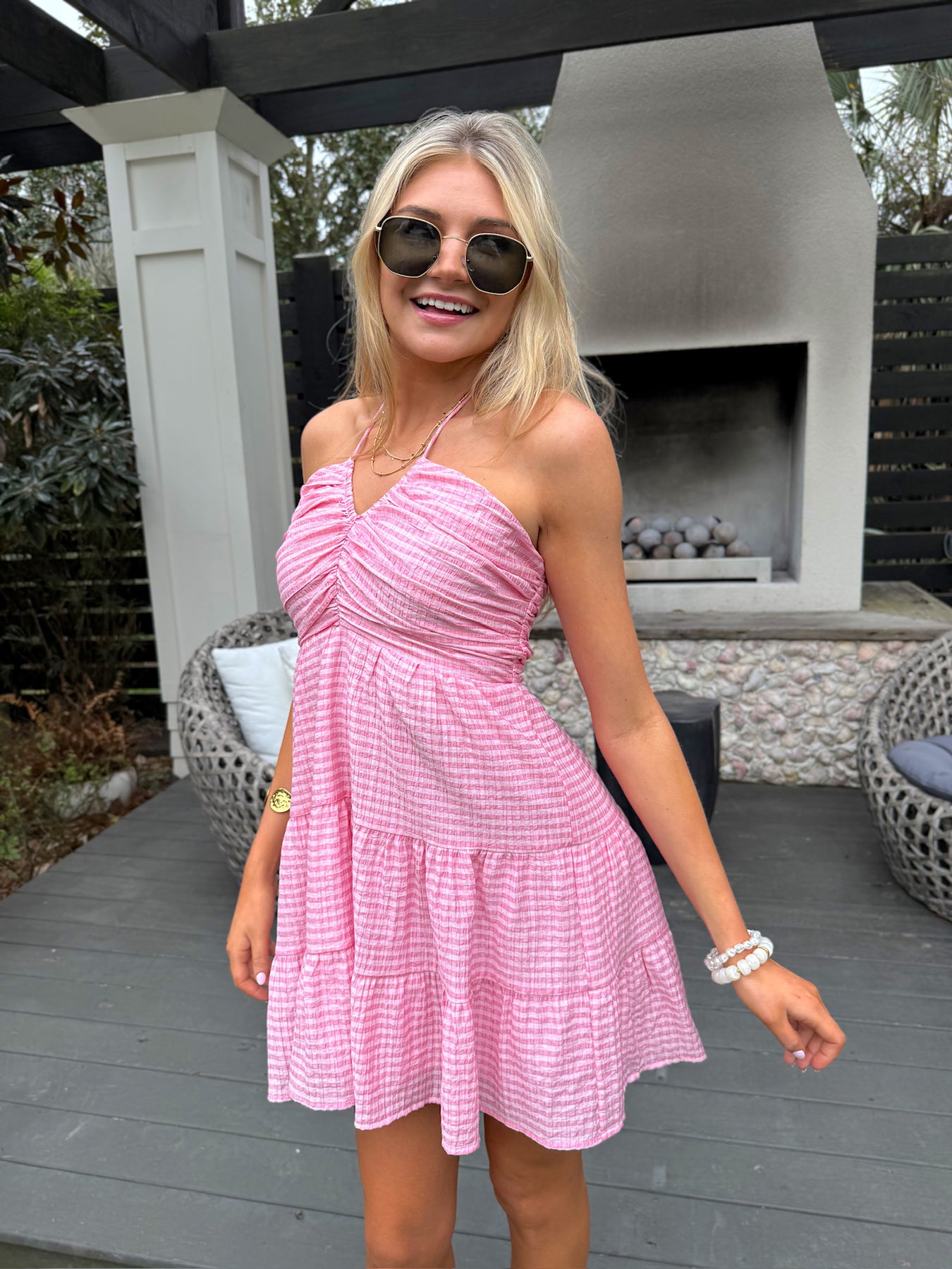 This dress features a halter neckline with V detailing, sleeveless, self-tie straps, tiered detail, ruched details at top, small smock back panel, gingham print, lined, and mini length.